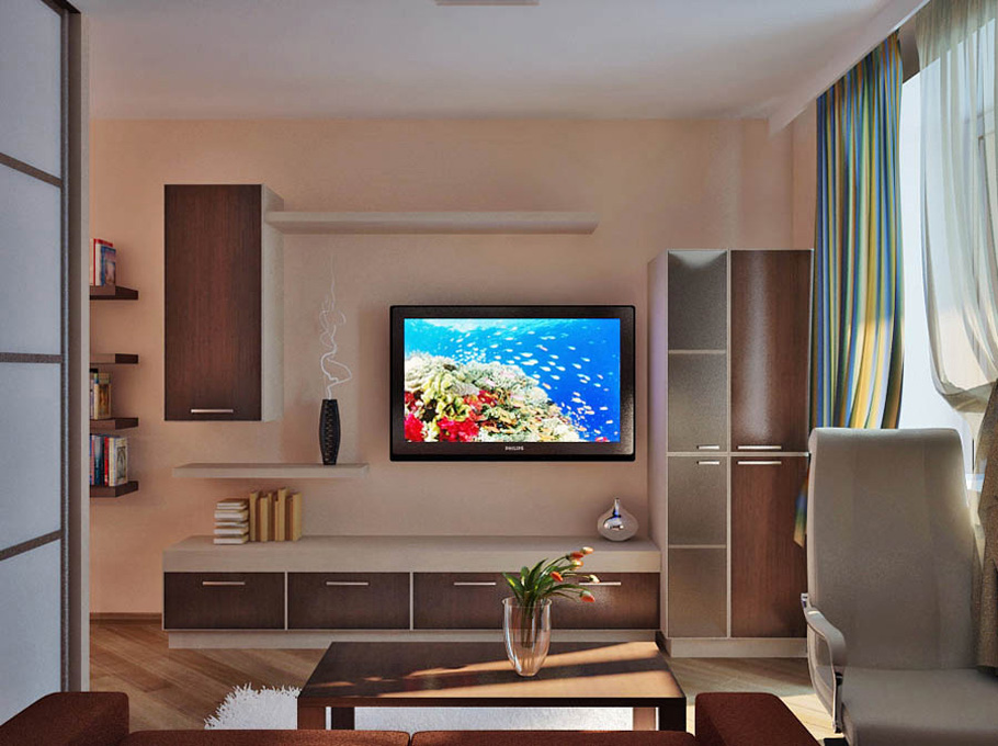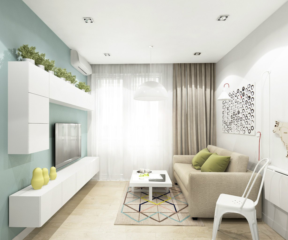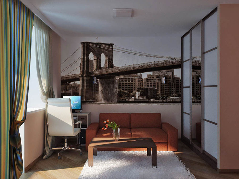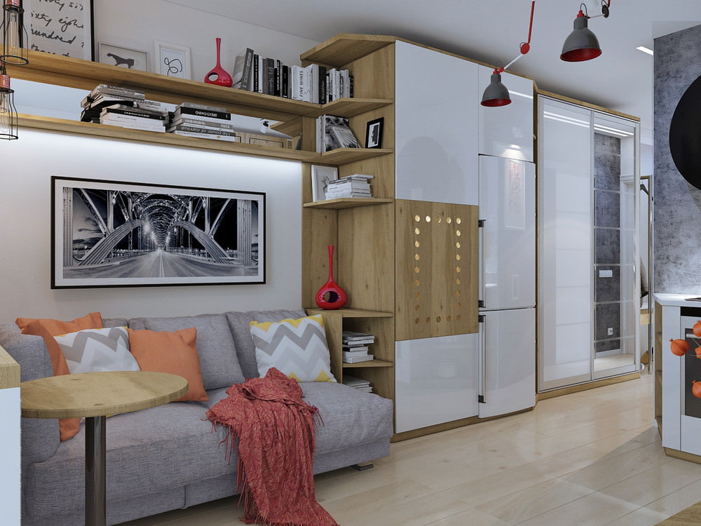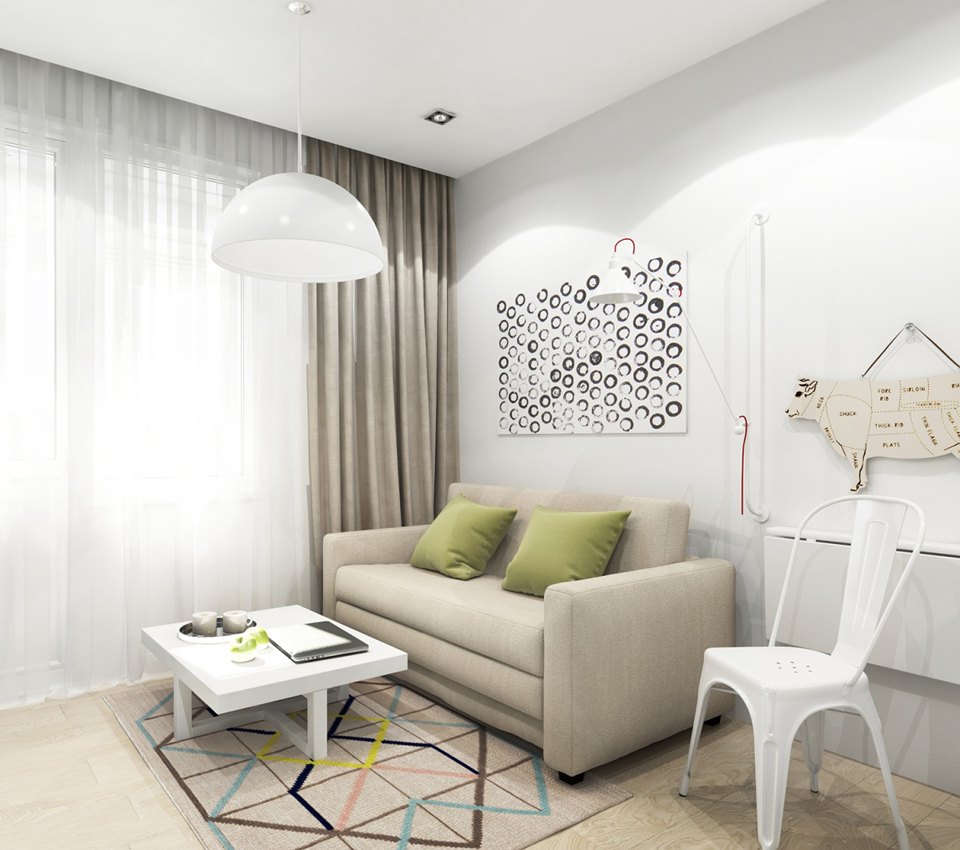 Dans un design d'intérieur moderne, une telle pièce est faite comme un studio, si populaire à l'étranger parmi les étudiants et les jeunes. Dans ce cas, la tâche principale est le zonage correct de la pièce et l'utilisation d'astuces pour augmenter visuellement l'espace.