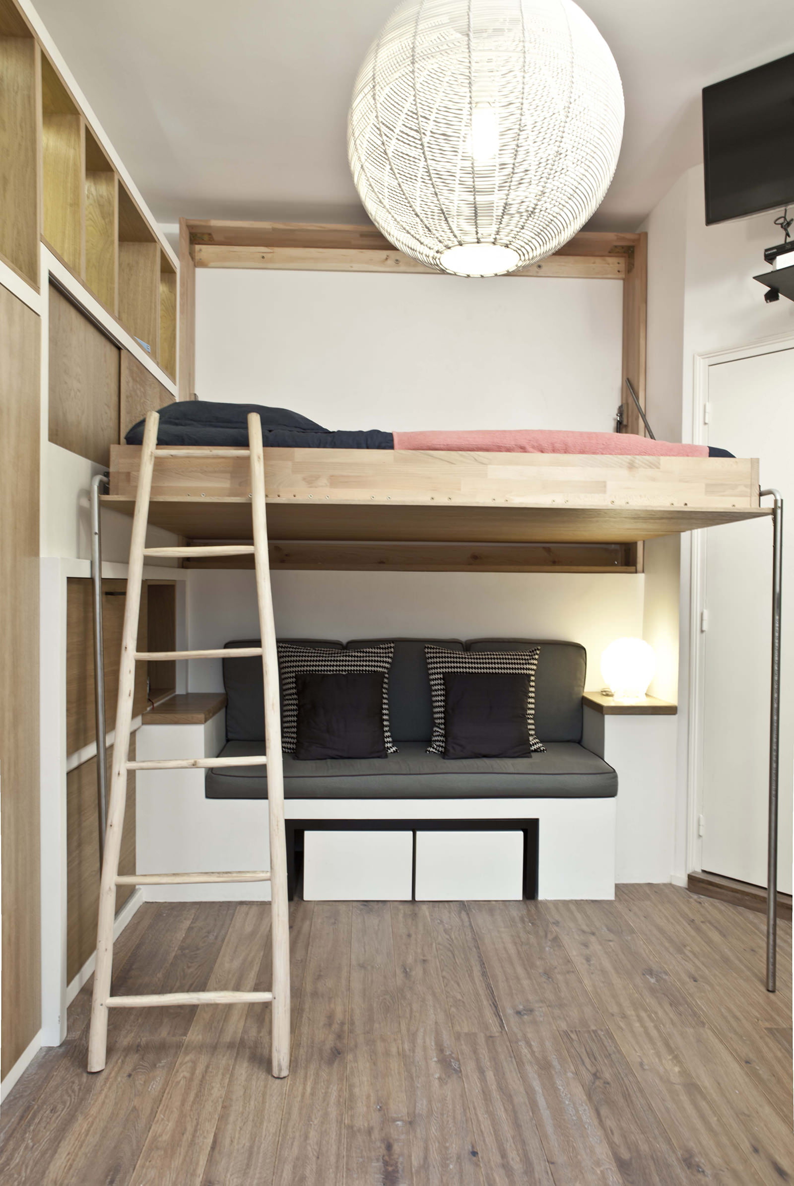 Le zonage de ce studio se fait à l'aide d'une cloison coulissante vitrée
