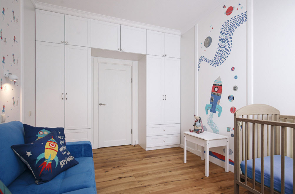La couleur bleue n'est pas si souvent utilisée pour concevoir une pépinière. On pense qu'il est plutôt sombre et mal à l'aise en termes de perception. Mais, c'est une erreur, car il est important de savoir quelle nuance de bleu est utilisée et dans quelle combinaison. Si vous combinez des nuances bleu clair avec du sable et du lait, cette combinaison convient à un intérieur dans un style marin. Les garçons seront satisfaits d'une telle pièce.