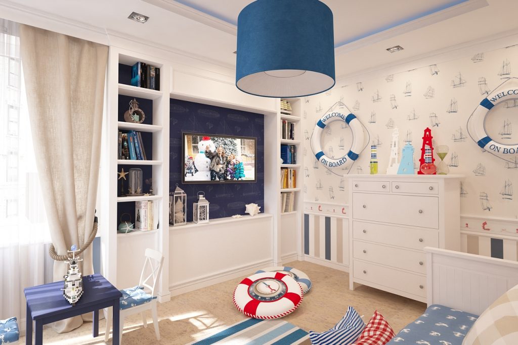 Tons bleus et blancs - une solution traditionnelle pour la chambre d'un garçon