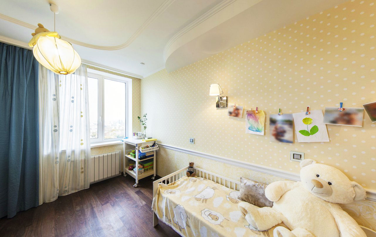 - Dans les petites zones, par exemple à Khrouchtchev, il est préférable d'utiliser des teintes extrêmement claires. Mais de toutes les manières possibles pour éviter le blanc. Tout d'abord, cela peut sembler ennuyeux pour un enfant.Deuxièmement, avec une mauvaise organisation de l'éclairage extérieur et intérieur, il acquiert toujours une teinte grisâtre sale.