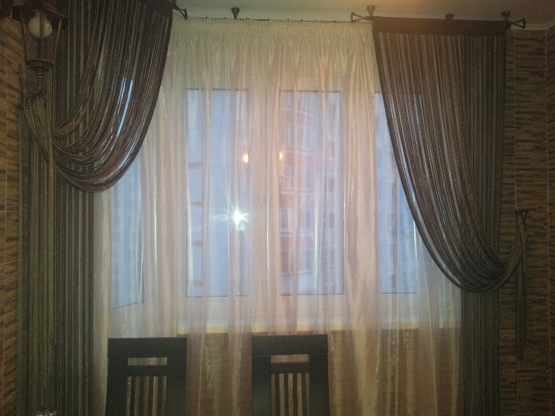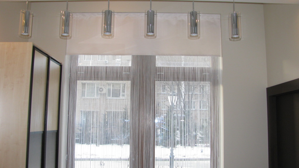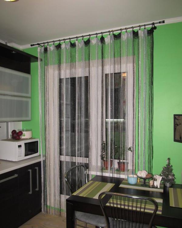 - Dans une petite cuisine, les rideaux en mousseline en forme de nouilles larges auront l'air trop encombrants, dans un espace aux mètres carrés limités, une corde fine sera pertinente.