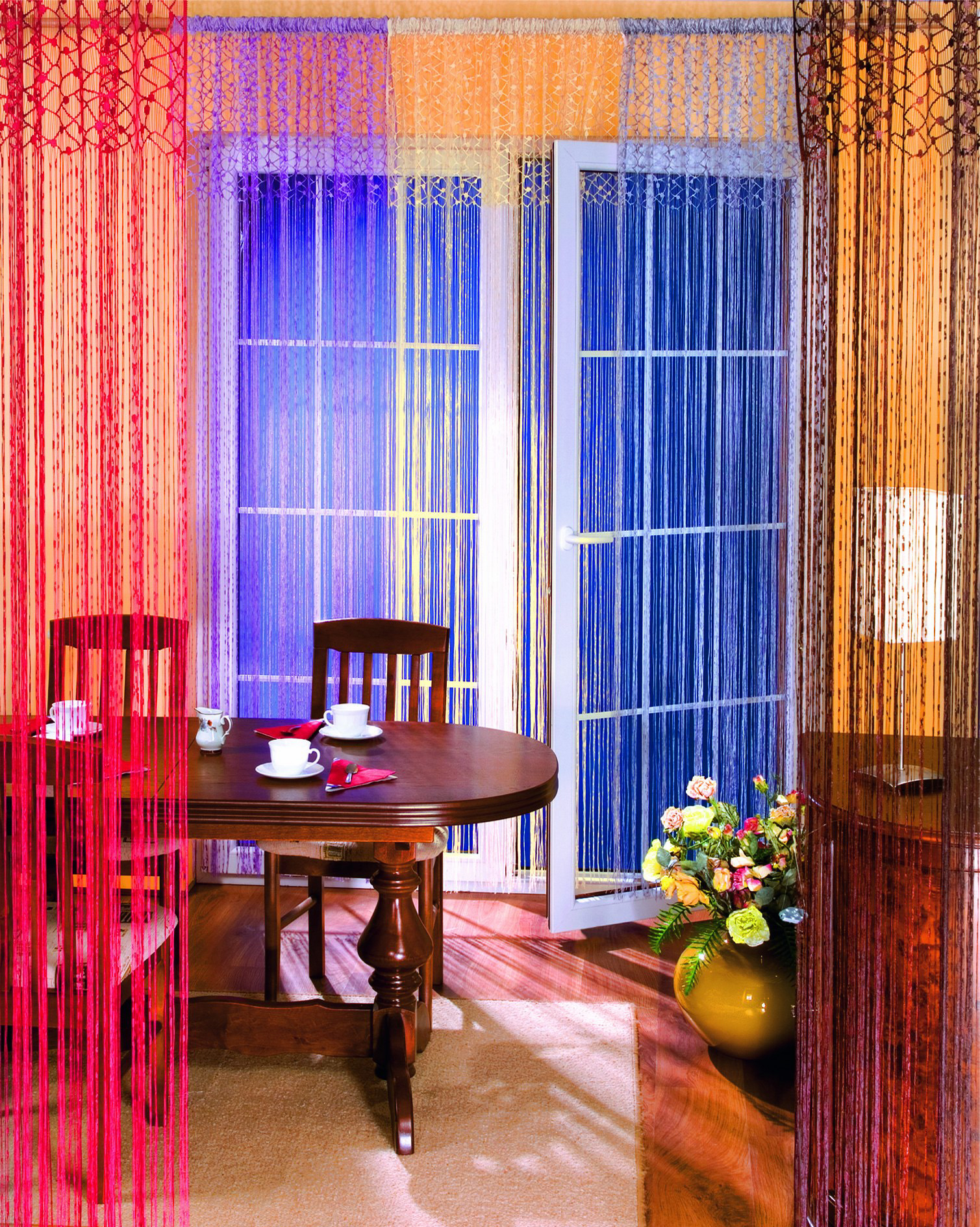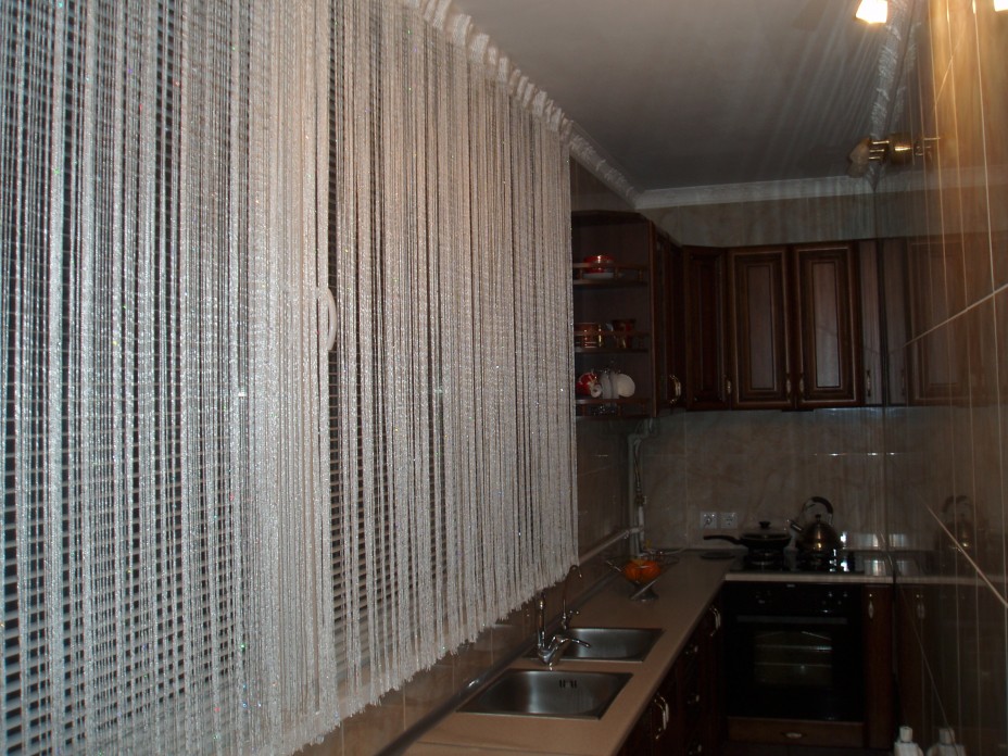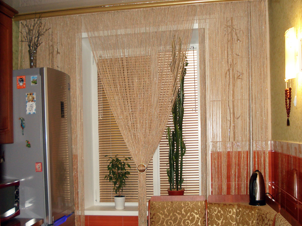 - Afin de raccourcir les rideaux de filament dans la cuisine, vous n'avez pas besoin de contacter l'atelier, vous pouvez les couper vous-même à la longueur souhaitée. Le fil est en synthétique, qui ne s'ouvre pas.