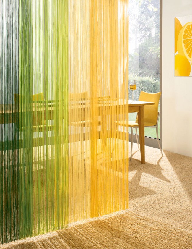 Toute pièce avec une grande ou une petite zone peut être divisée en zones. À l'aide de rideaux en filament, créez un coin de détente ou un lieu de travail. Le principal avantage de la partition en mousseline est qu'elle n'encombre pas l'espace. À l'aide de draperies et d'accessoires supplémentaires, vous pouvez créer une grande variété d'effets optiques.