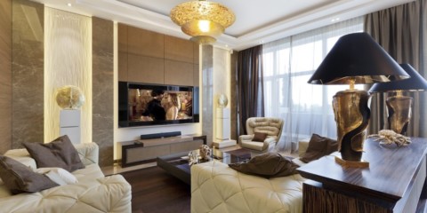 - Eclairage Il doit être lumineux avec un éclairage supplémentaire des zones fonctionnelles de la pièce. Ajoutez des appliques, des lampadaires et des lampes de table au grand lustre du salon. L'éclairage ponctuel avec des lampes LED et des rubans dans la zone de travail de la cuisine sera superbe.