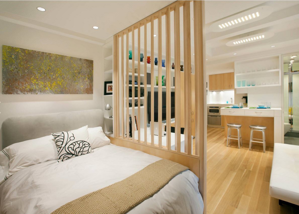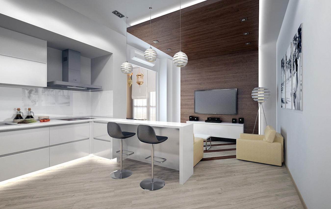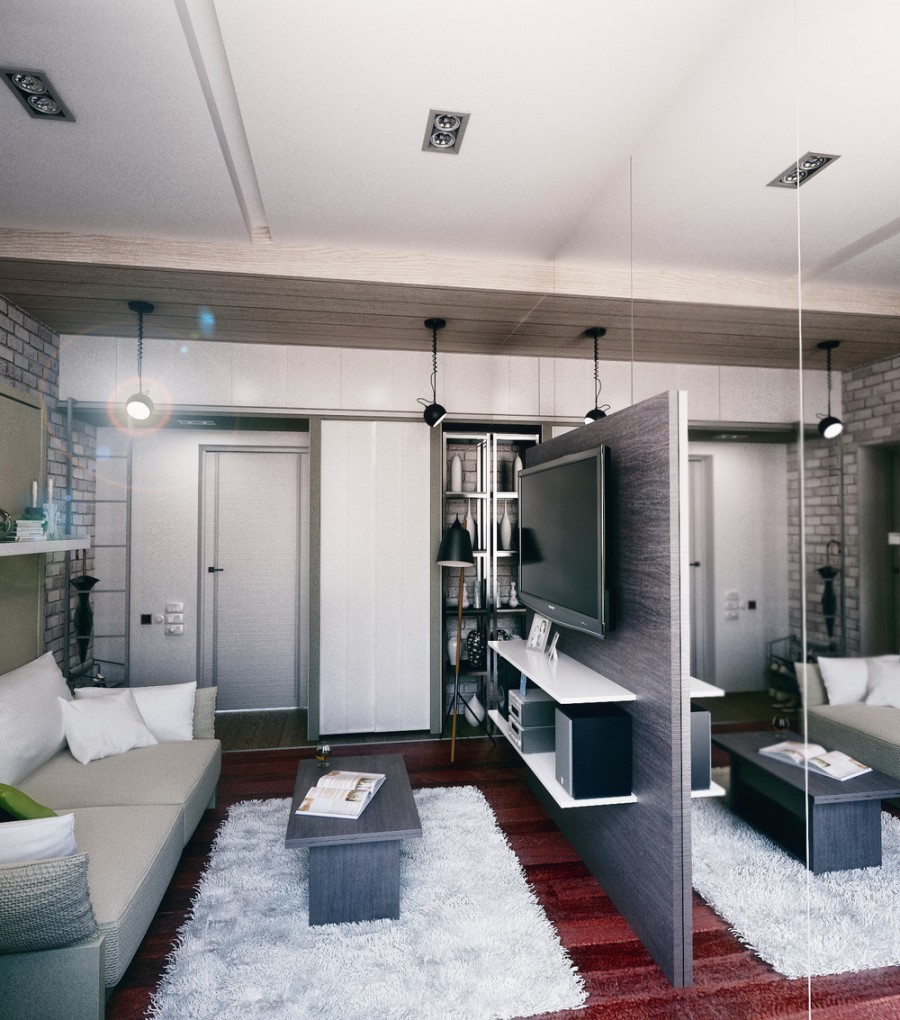 La meilleure solution pour le studio. Des couleurs claires appliquées dans la décoration et le mobilier, un éclairage lumineux rendront la pièce plus lumineuse et plus chaude. Seuls les meubles et les armoires coulissantes nécessaires qui fusionnent avec les murs ajouteront visuellement des mètres carrés à votre appartement.