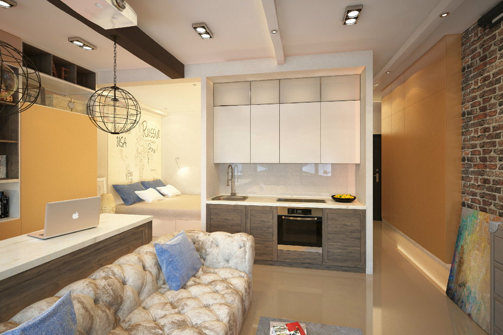 Studio design sur 20 m². m nécessite une préparation pour le processus d'arrangement. Après avoir effectué la réparation, il sera difficile de refaire quelque chose, et une cloison ou un canapé mal placé peut causer beaucoup d'inconvénients.
