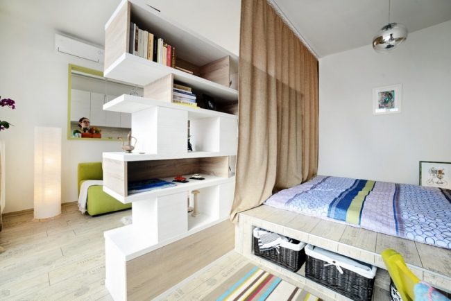 - Racks et partitions. Lors du zonage de la pièce, privilégiez les produits en verre et les structures creuses. Ils n'occupent pas de surface utilisable et laissent entrer la lumière.