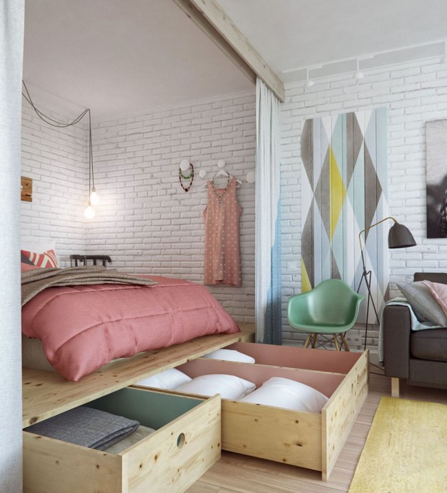 Si votre famille prévoit de se reconstituer ou a déjà un enfant, alors vous devriez penser à un espace séparé pour le bébé et un endroit pour les jeux. Pour ce faire, vous devez sacrifier votre lit et vous déplacer vers le canapé du salon pour que votre enfant dorme dans un espace séparé. La meilleure solution serait d'installer un coin enfant, qui combine un coin couchage, une table pour les jeux et une armoire pour les vêtements. Il serait préférable de clôturer un tel coin avec un écran pour que le bébé se sente à l'aise.