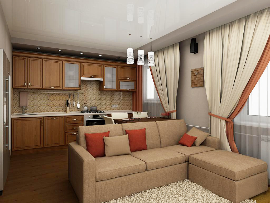 Une pièce rectangulaire implique l'installation d'un ensemble de cuisine en U, distinguant ainsi clairement les limites du salon et de la cuisine. Ensuite, il n'est pas nécessaire d'installer une partition entre les pièces.