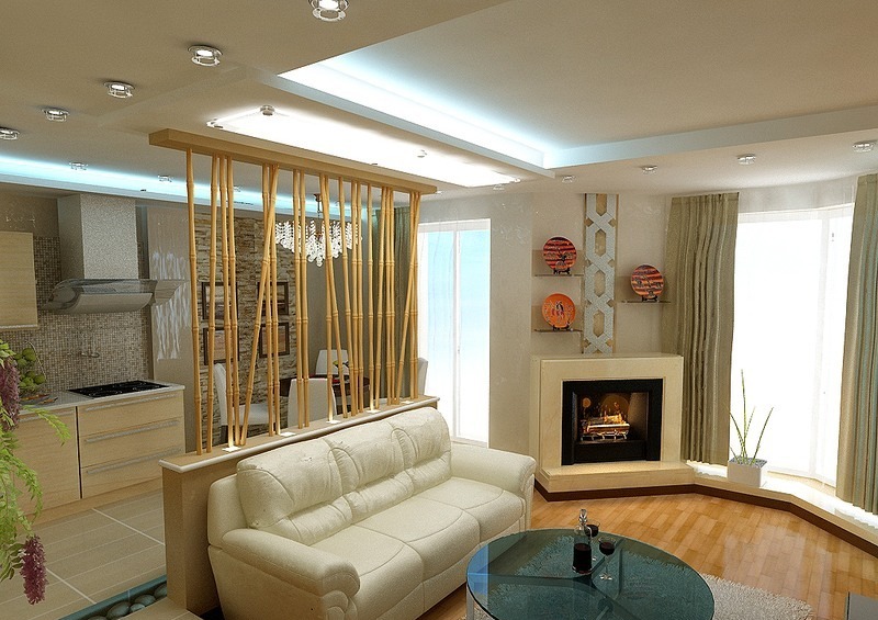 Dans une pièce carrée, il est préférable de positionner le casque de façon linéaire le long du mur. Et avec l'élément de zonage, choisissez un bar, un écran lumineux ou une étagère à air, qui ajoutera des étagères supplémentaires pour les plantes d'intérieur ou de magnifiques bibelots.