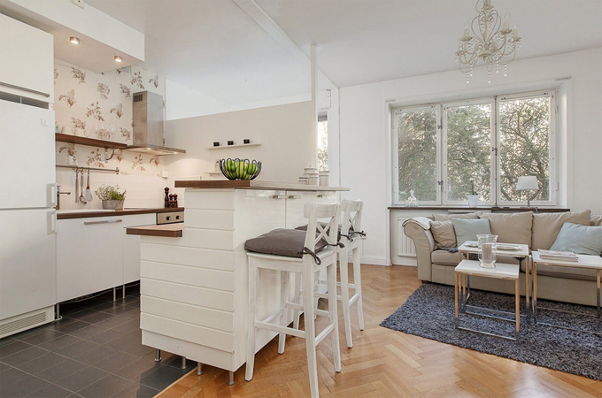 Un studio carré dans lequel le coin cuisine est séparé par le comptoir du bar du reste de la pièce