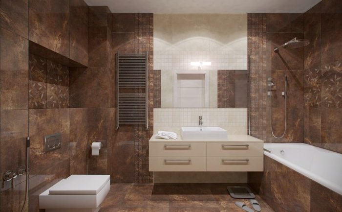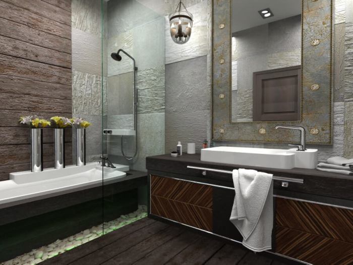 Pour la salle de bain, vous devez choisir un carreau de céramique qui imite autant que possible la pierre - il peut s'agir de grès, de marbre ou de calcaire. Chacun d'eux aura l'air assez bon pour transmettre l'esprit de ce style.