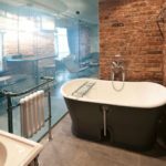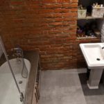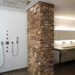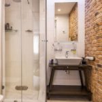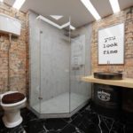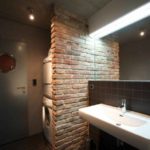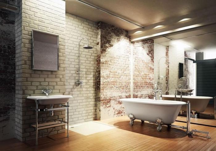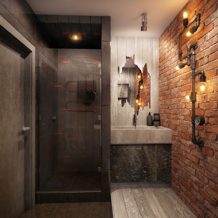 La salle de bain, organisée en style loft, étant avant tout une pièce autrefois industrielle et non résidentielle, il est nécessaire de rapprocher toutes les surfaces des murs et des sols de ces pièces. Si la pièce a un mur recouvert de briques, il vous suffit de le mettre en ordre, et en aucun cas de ne pas blanchir, de ne pas recouvrir de carreaux de céramique et de ne pas peindre. Autrement dit, laissez-le aussi naturel que possible. Si la pièce n'avait pas initialement de telles surfaces, vous devez choisir des options de finition qui imitent au maximum la pierre naturelle ou la brique.