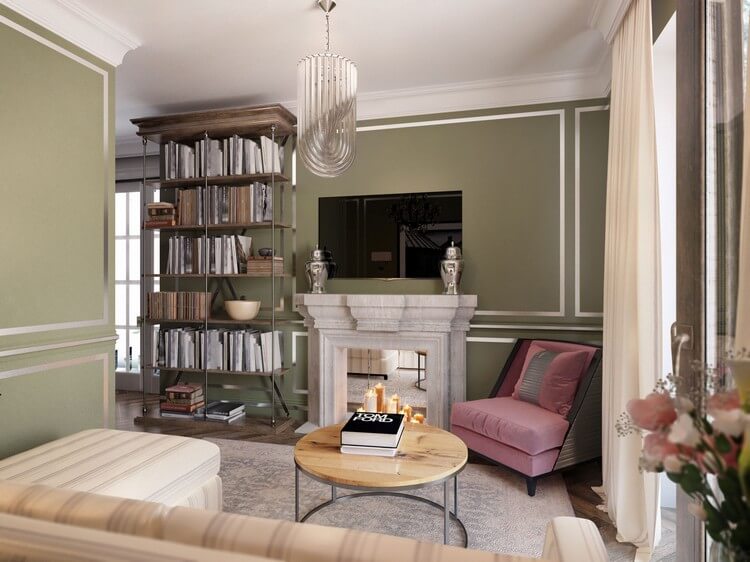 ห้องนั่งเล่นที่สะดวกสบายในสีชมพูเจือจางด้วยสาดน้ำของดอกไม้สะระแหน่และมะกอก