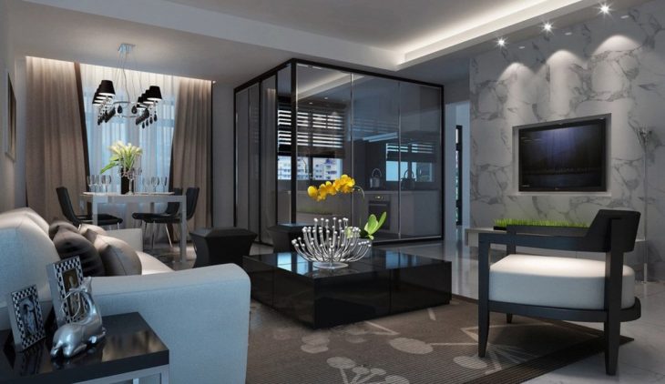 การรวมกันของสีขาวและสีดำดูสวยงามและทันสมัยในการตกแต่งภายในของห้องนั่งเล่น