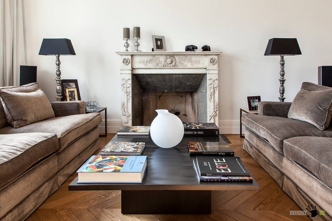 ตัวเลือกที่ดีที่สุดคือปาร์เก้ มันจะสร้างความรู้สึกที่หรูหราและสะดวกสบายอย่างแน่นอน! และในใจกลางหรือใกล้เตาผิงใกล้โซฟาคุณสามารถโยนพรมเล็ก ๆ หรือซ่อน มันจะมีสไตล์และสะดวกสบาย!
