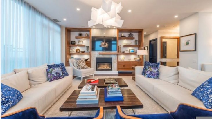การตกแต่งภายในของห้องนั่งเล่นอย่างกลมกลืนมีลักษณะก่ออิฐบนผนังสำเนียงที่มีเตาผิง