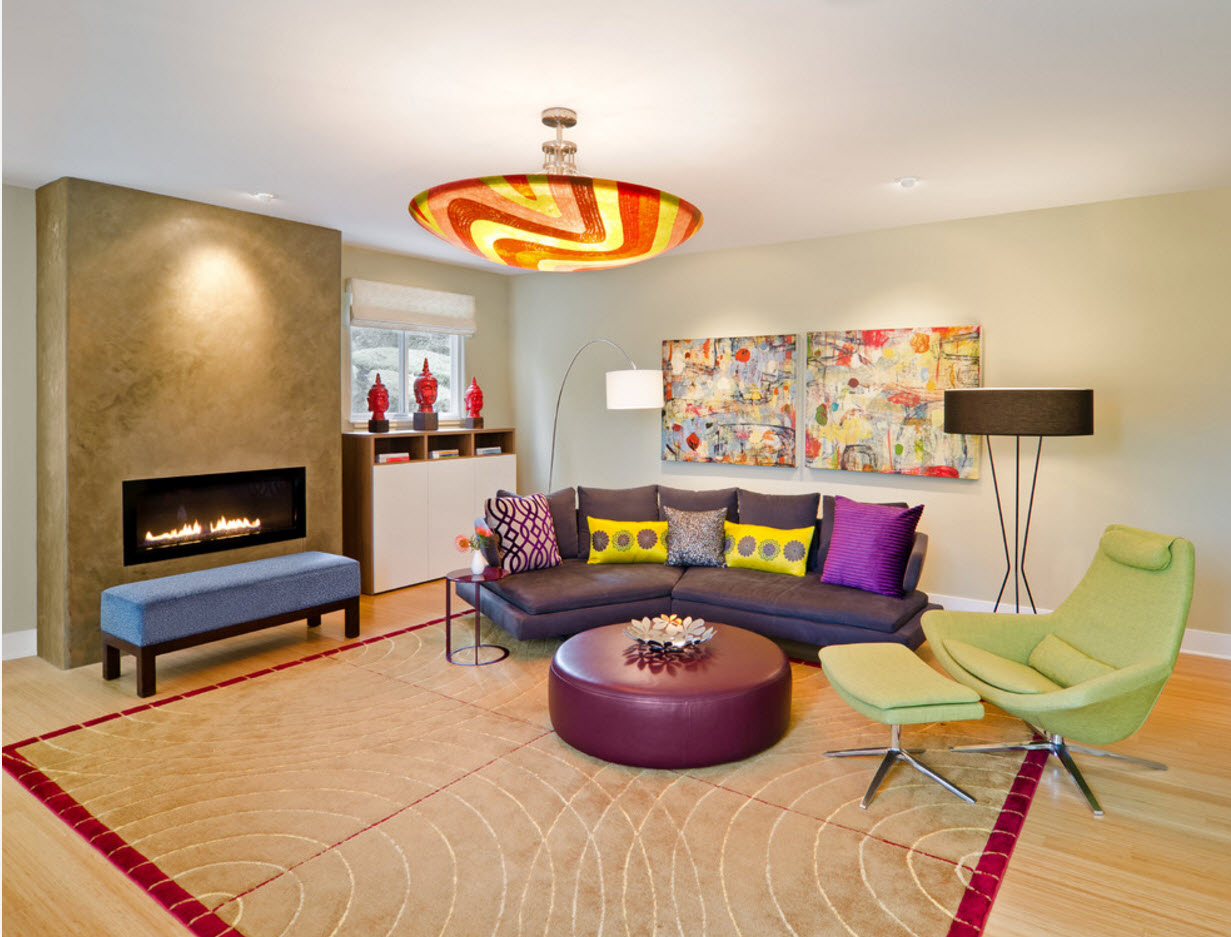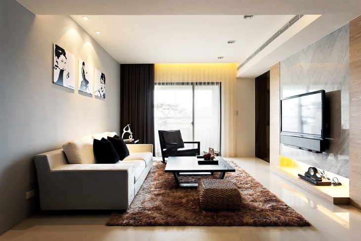 พรมที่สดใสด้านหน้าโซฟาจะช่วยเพิ่มความอบอุ่นและความสบายให้กับการตกแต่งภายในที่ทันสมัย