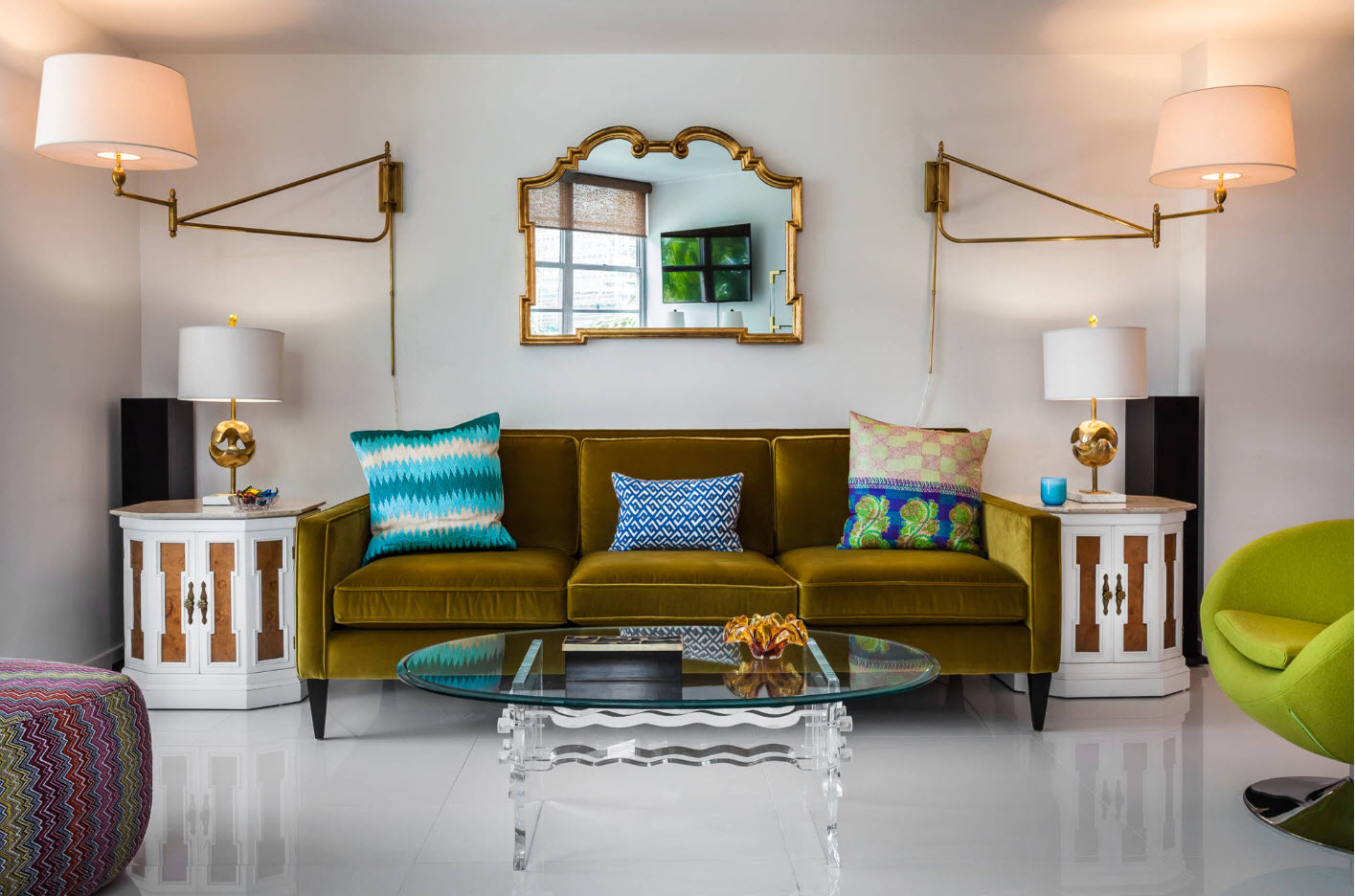 โซฟาที่มีเบาะที่สว่างจะกลายเป็นสำเนียงที่น่าทึ่งและเจือจางการตกแต่งภายในที่เรียบง่าย