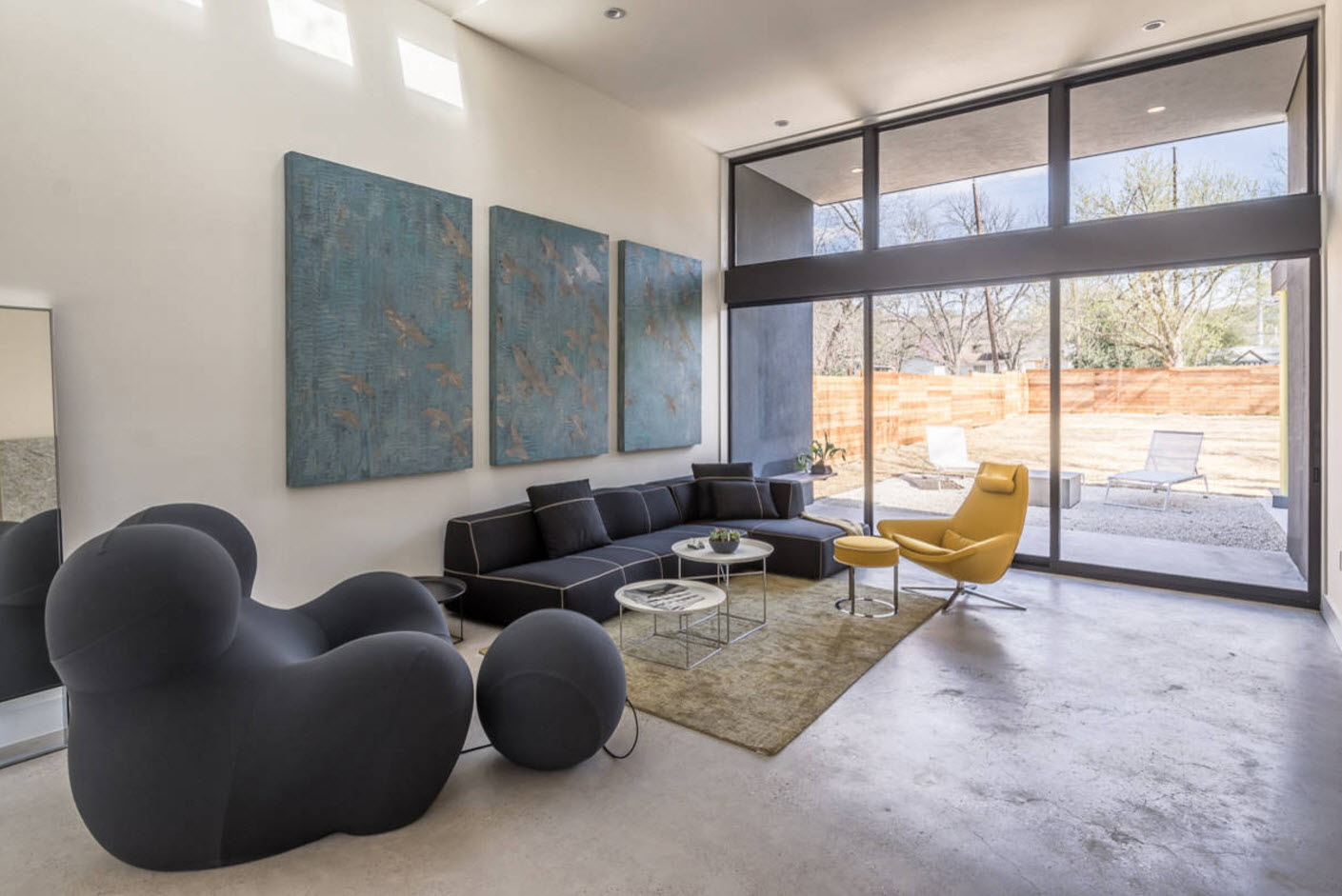 หน้าต่างพาโนรามาขนาดใหญ่เติมห้องนั่งเล่นด้วยแสงธรรมชาติ