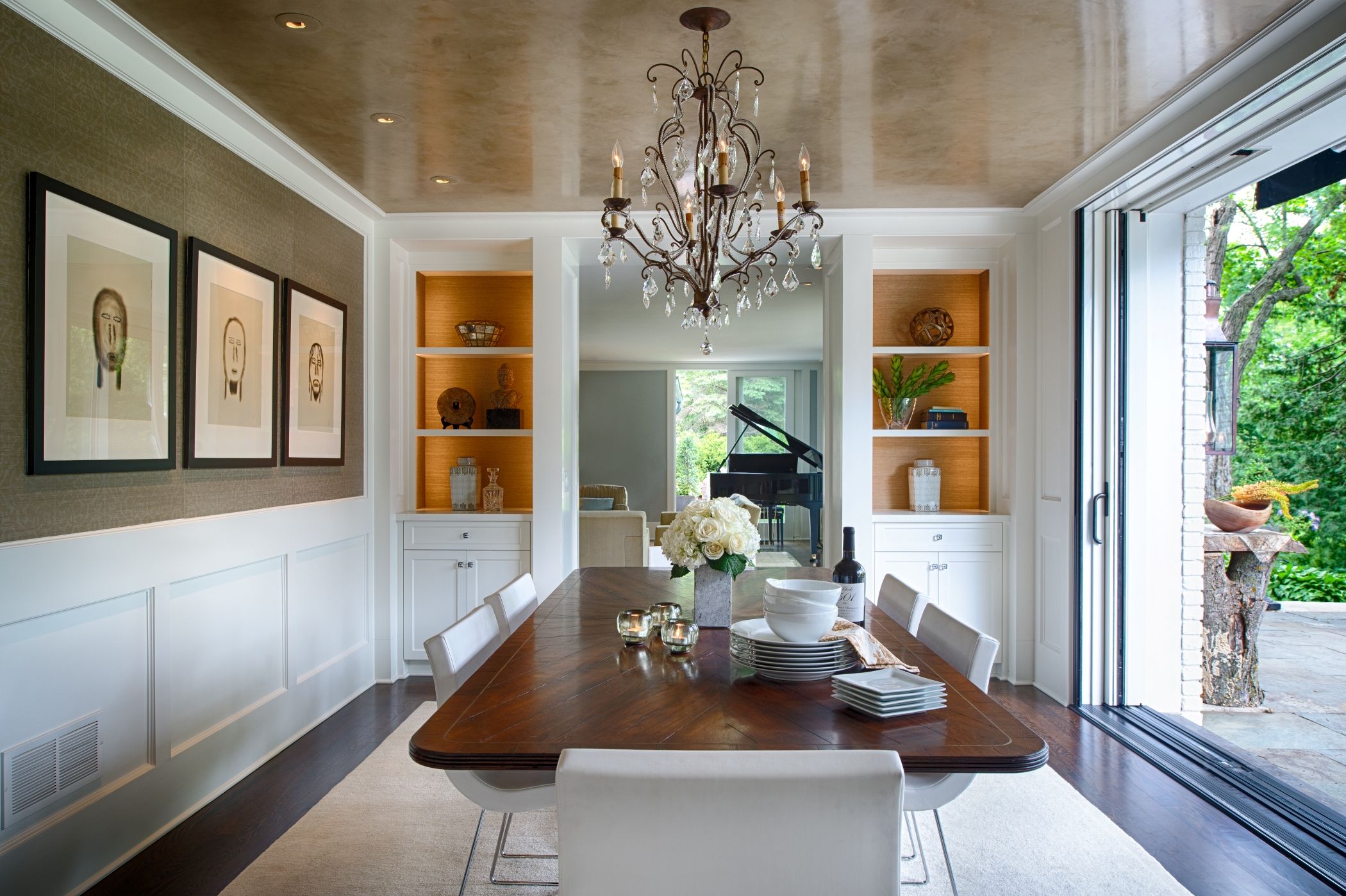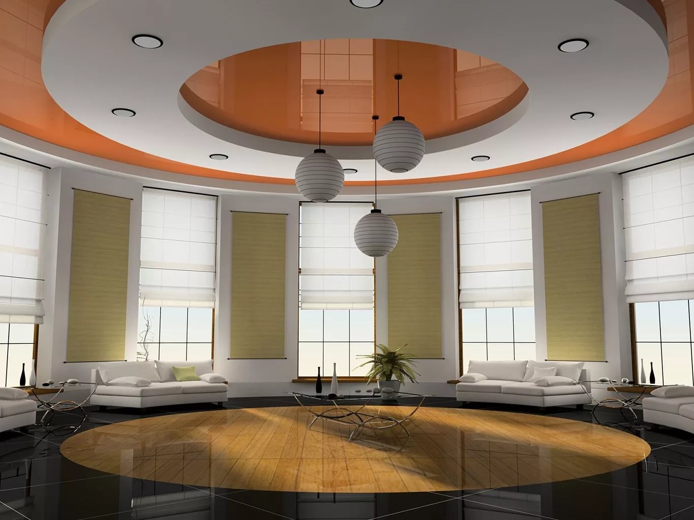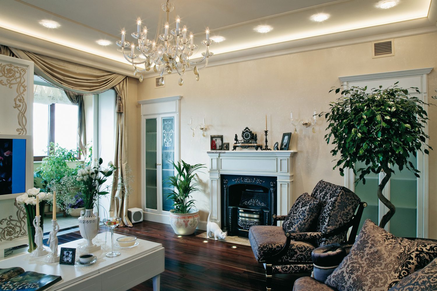 - การจัดวางโคมระย้าหนึ่งสำเนาที่กึ่งกลางเพดาน;