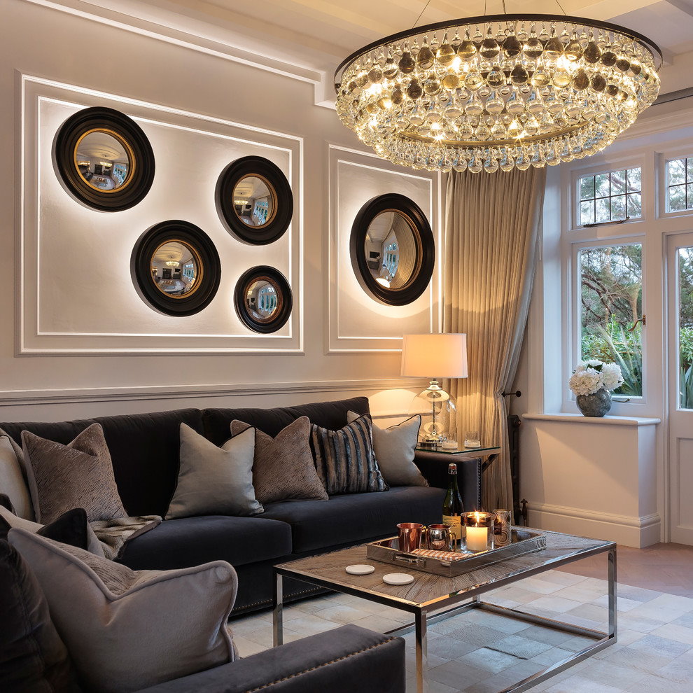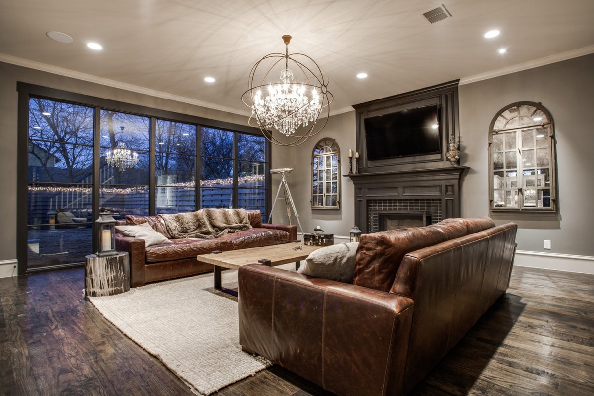 - ภาพถ่ายแนวคิดการตกแต่งภายในของห้องพร้อมโคมระย้าบนเพดานยืด