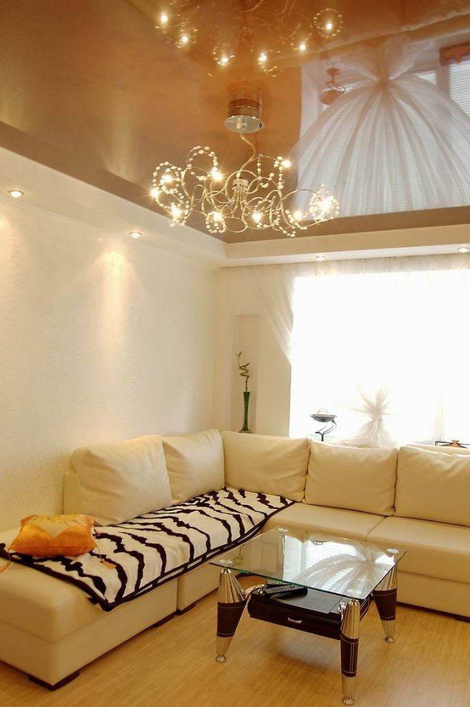 โคมระย้าที่เลือกอย่างถูกต้องสามารถเน้นความงามของเพดานยืดได้