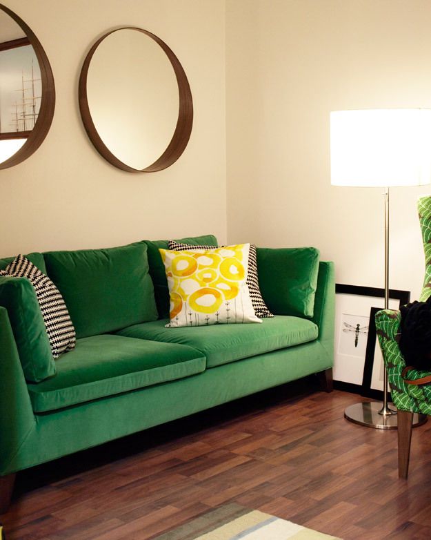- หากเบาะเฟอร์นิเจอร์เป็นสีเขียวสดใสคุณสามารถเลือกวัตถุสีม่วงสีส้มหรือสีเหลืองเป็นของตกแต่งได้