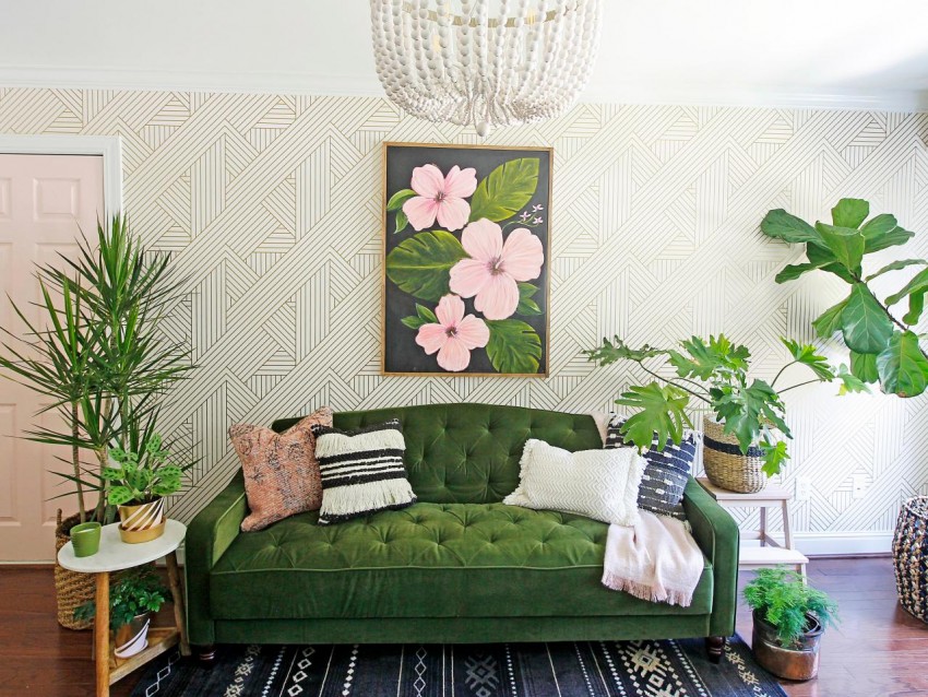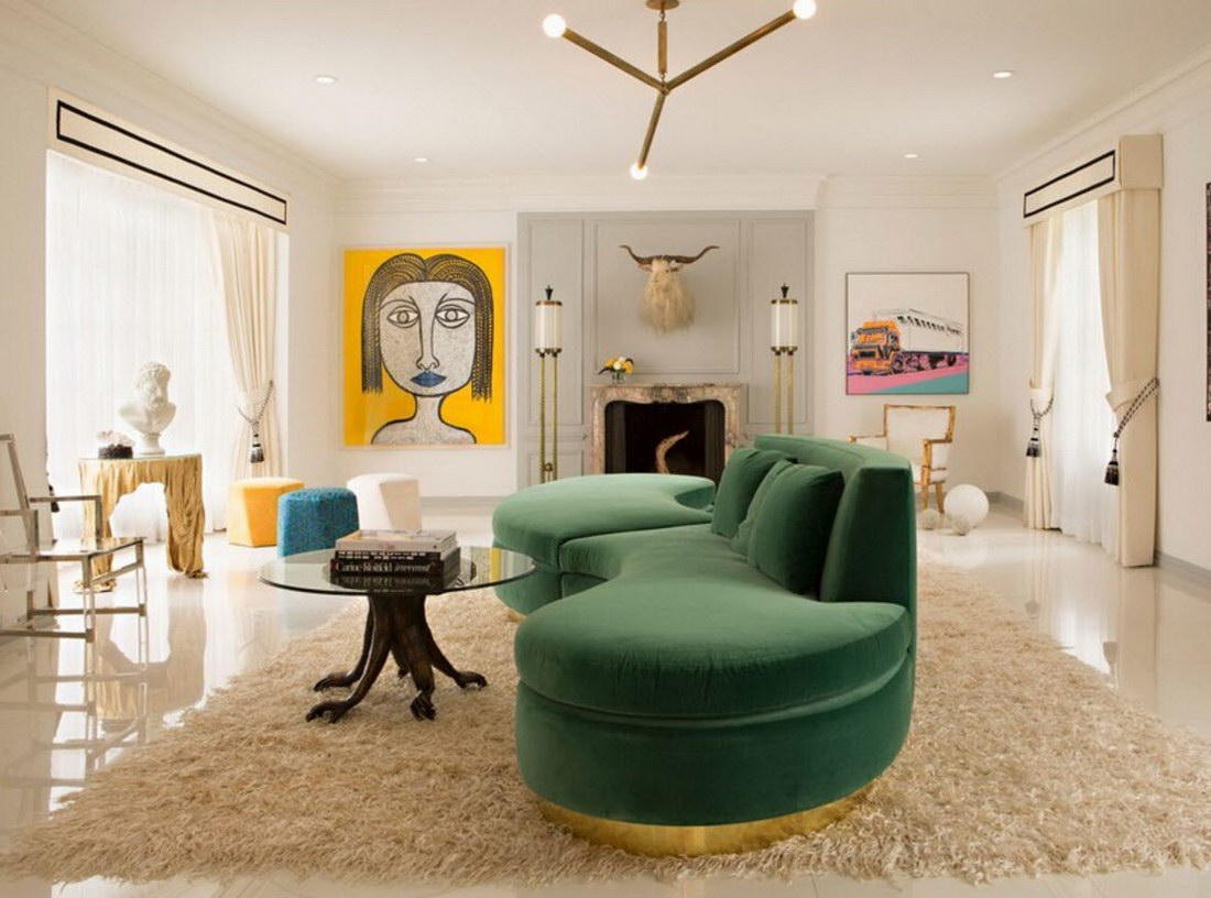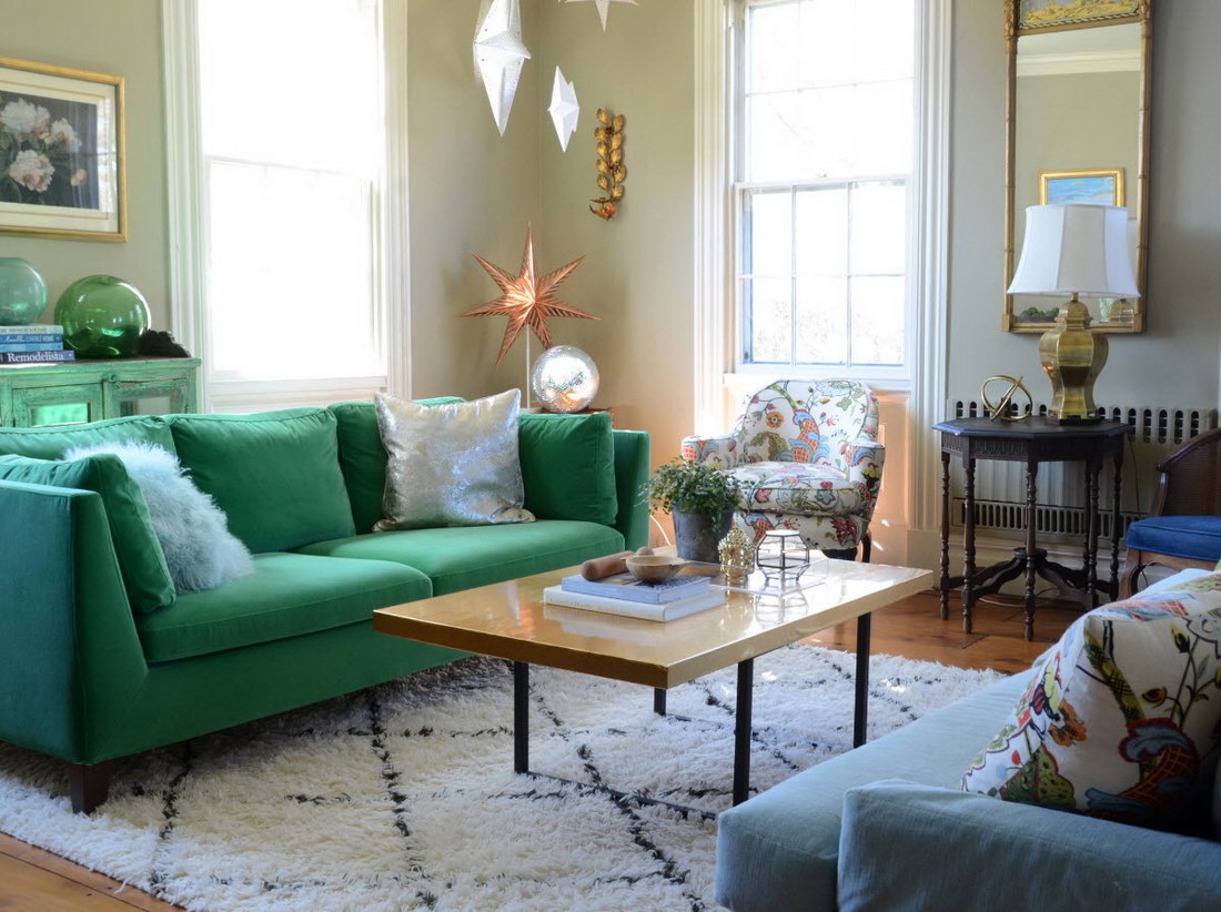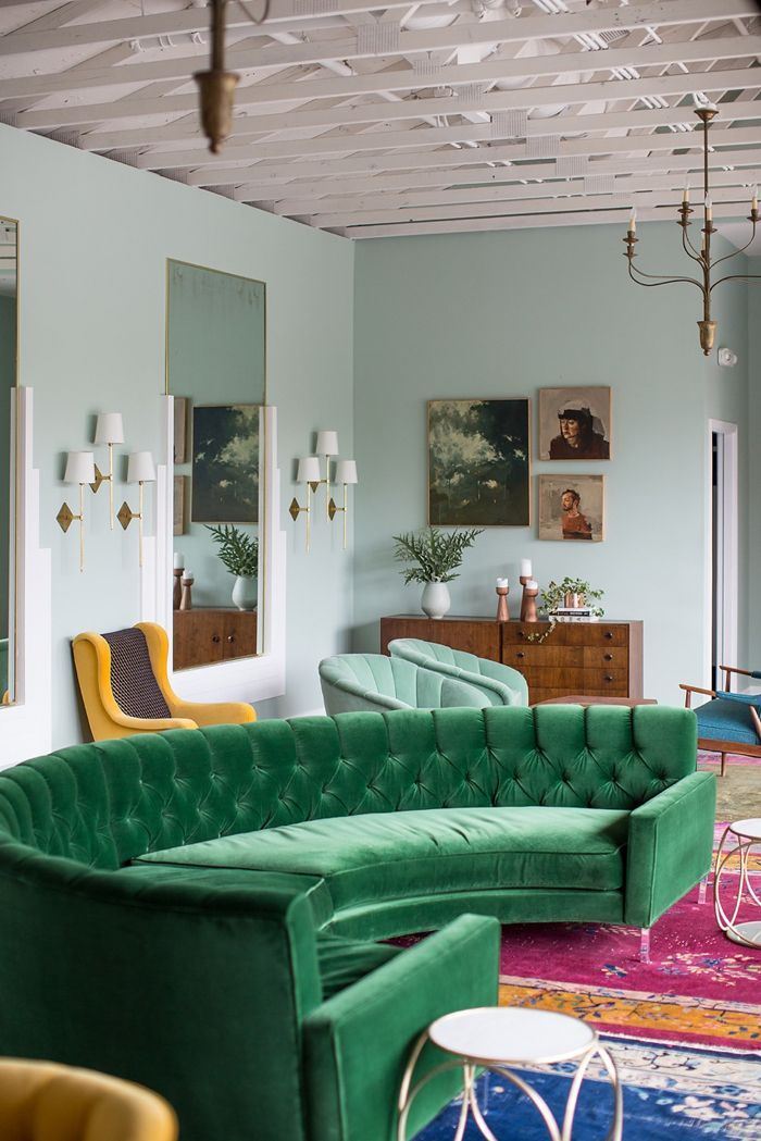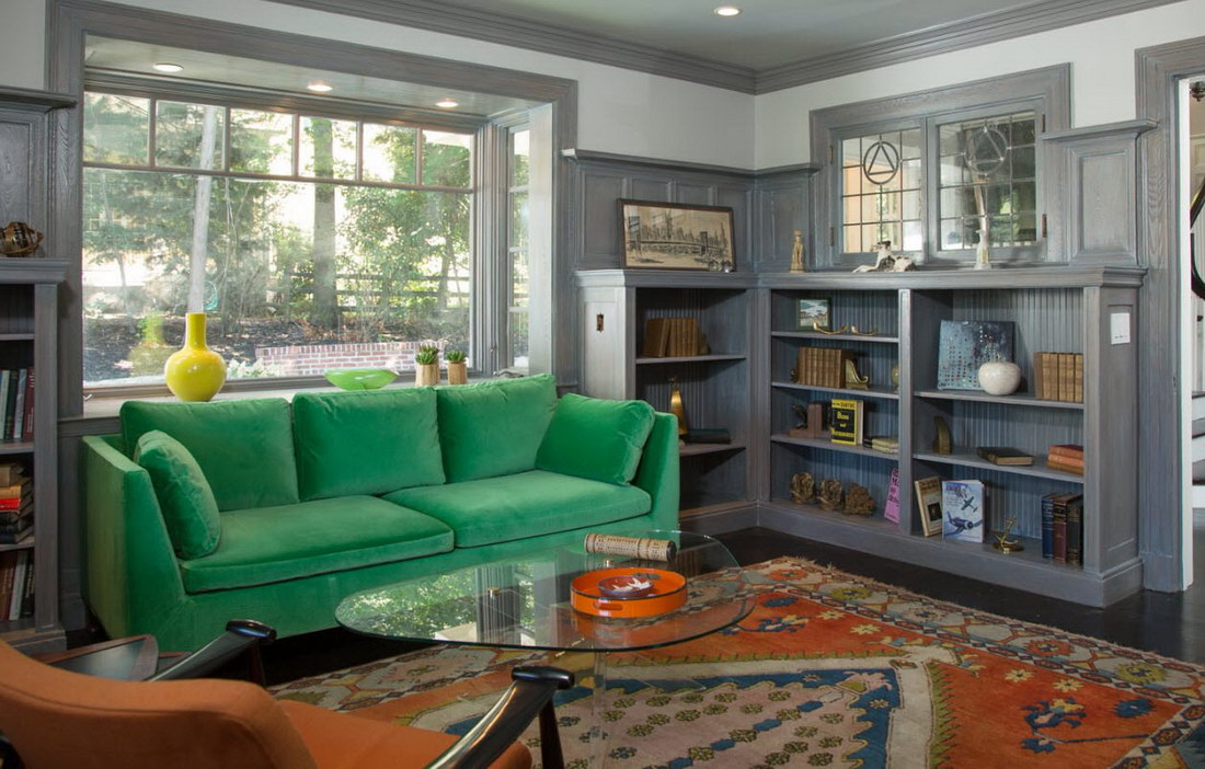 การรวมกันของโซฟาสีเขียวกับองค์ประกอบภายในสีที่แตกต่างกัน