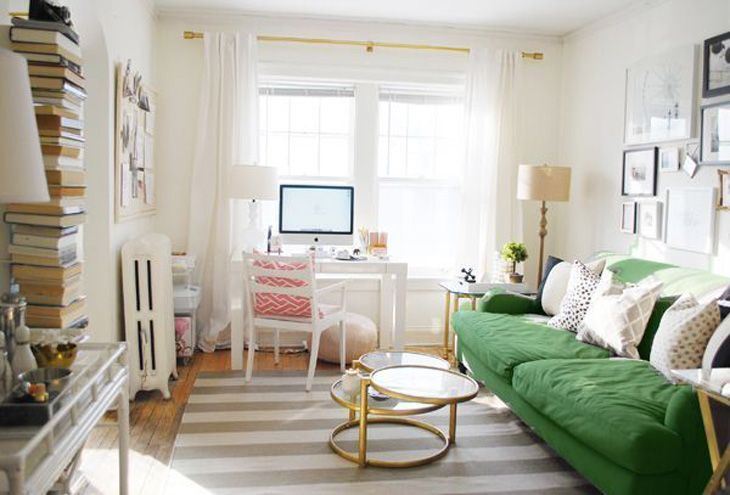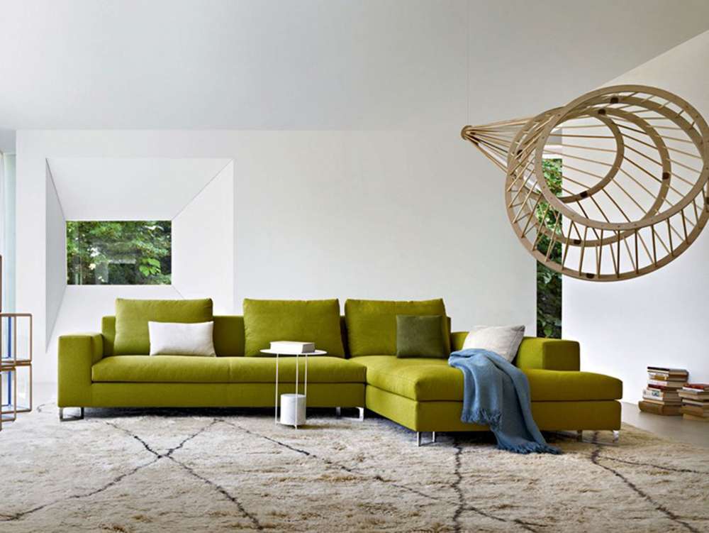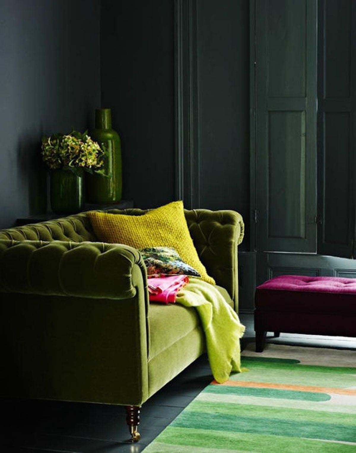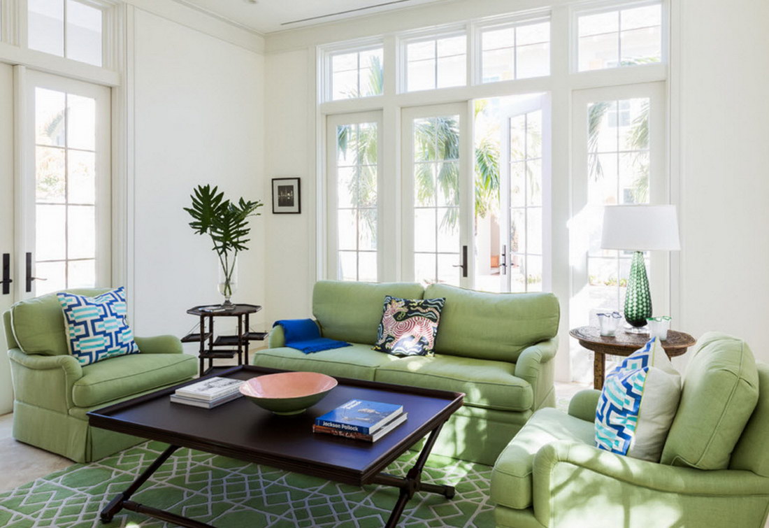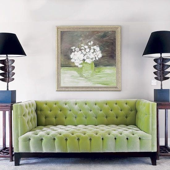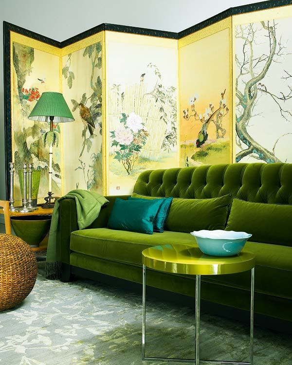 ตามกฎแล้วสีเขียวมีความเกี่ยวข้องกับธรรมชาติหญ้าดังนั้นตั้งแต่สมัยโบราณจึงมีความเกี่ยวข้องกับความอุดมสมบูรณ์และการฟื้นฟู การใช้สีดังกล่าวในการตกแต่งภายในห้องทำให้เกิดความรู้สึกมั่นคงและเงียบสงบ อย่างไรก็ตามนี่ไม่ได้หมายความว่าคุณต้องทาสีผนังด้วยโทนสีดังกล่าวการมีโซฟาสีเขียวในห้องนั่งเล่นจะเป็นทางออกที่ดี