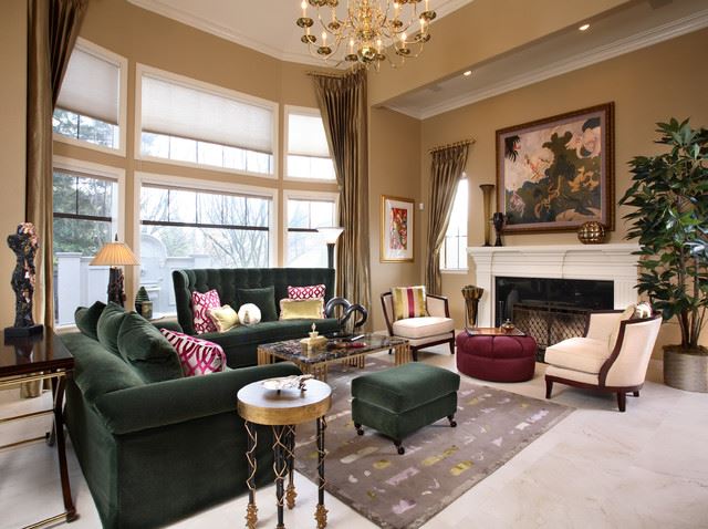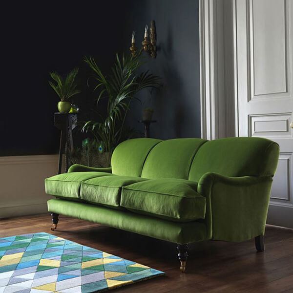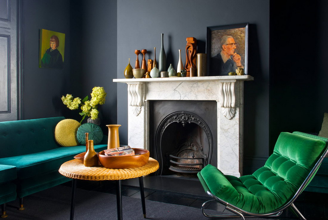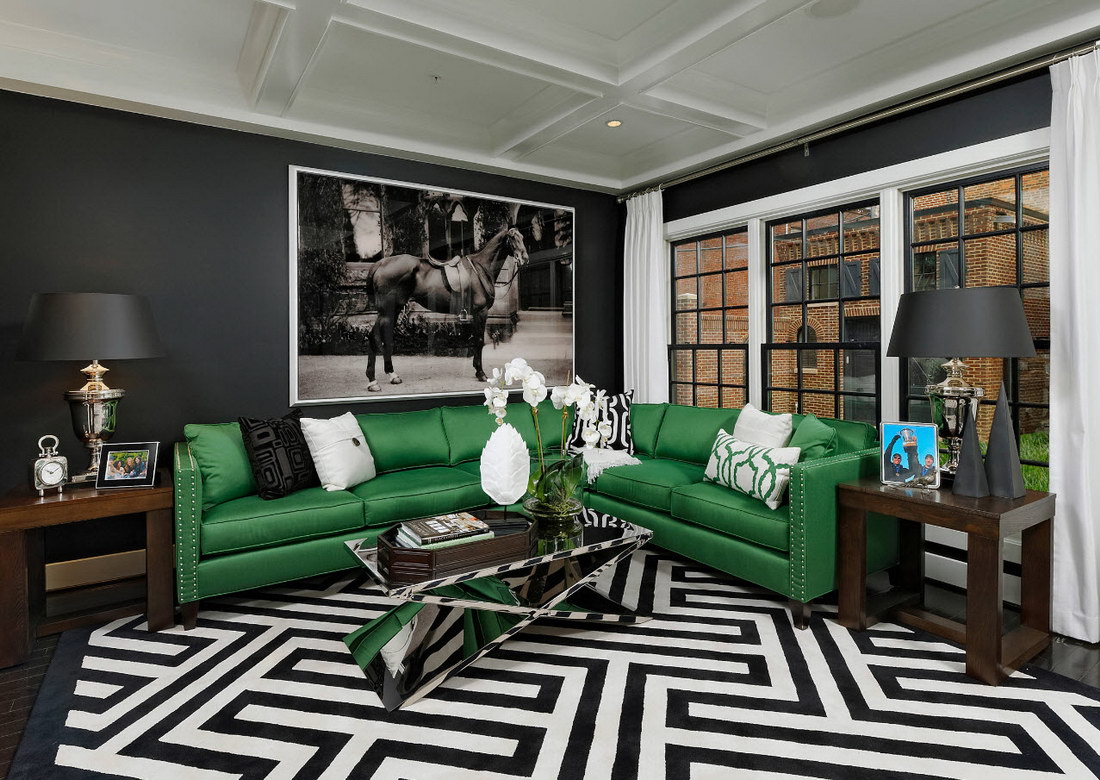 - โซฟาสีเขียวเข้ม โทนสีเข้มเข้มจะให้ความคิดริเริ่มของห้องนั่งเล่นและความหรูหราสร้างบรรยากาศที่มีเสน่ห์อันเป็นเอกลักษณ์