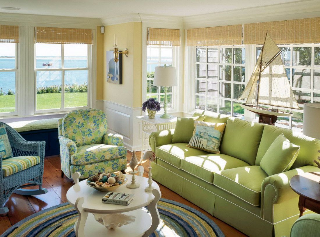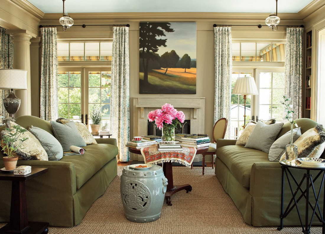 ผ้าม่านที่ทำจากผ้าธรรมชาติพิมพ์ลายดอกไม้รัฟเฟิลและลูกไม้จะกลมกลืนกับโซฟาสีเขียวอ่อน ผ้าหุ้มเบาะในกรณีนี้อาจเป็นผ้าลินินหรือผ้าฝ้าย