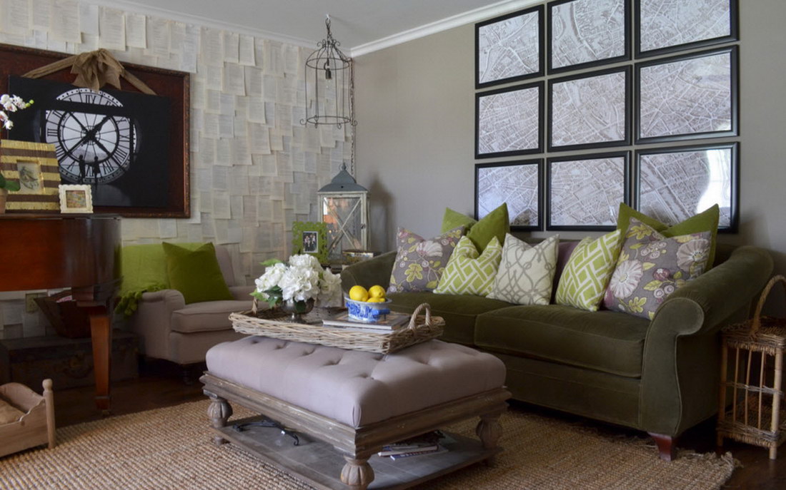 ภาพถ่ายแนวคิดที่น่าสนใจพร้อมโซฟาสีเขียวในการตกแต่งภายในห้องนั่งเล่น