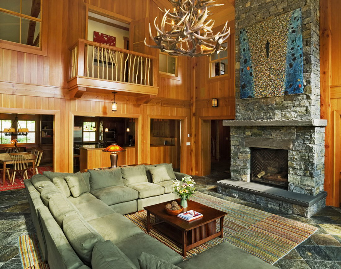 เบาะสีเขียวของโซฟาจะมีประโยชน์ในช่วงกลางของการตกแต่งภายในด้วย“ หินไม้”
