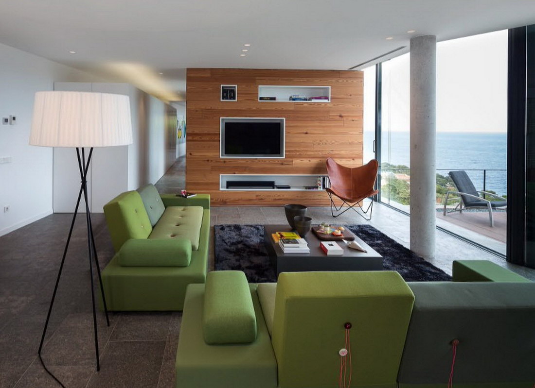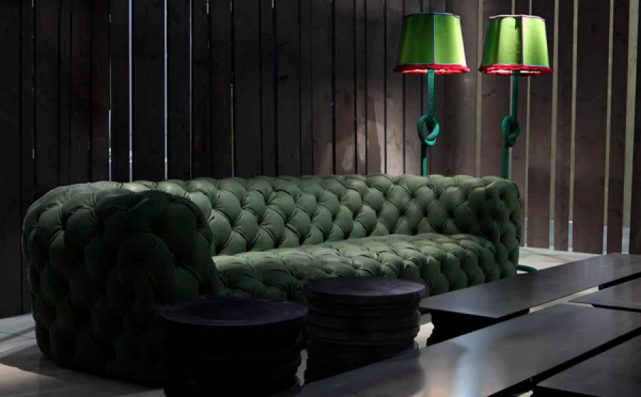 เบาะสีเขียวอ่อนของโซฟานั้นถูกรวมเข้ากับผนังสีเขียวของเฉดสีเข้ม