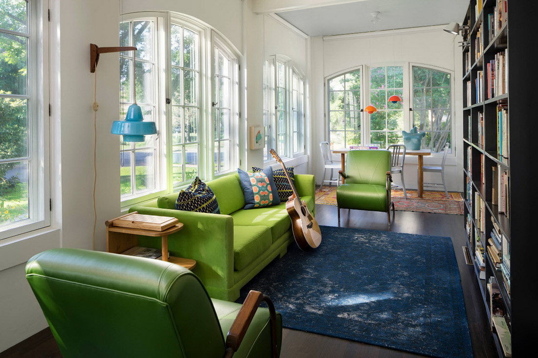 - การรวมกันของโซฟาสีเขียวกับองค์ประกอบภายในสีที่แตกต่างกัน