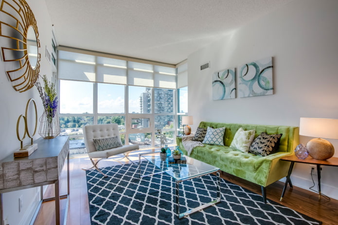 การปรากฏตัวของเฟอร์นิเจอร์สีเขียวทำให้ห้องดูเป็นธรรมชาติเบาะสามารถใช้ในหลากหลายเฉดสี: มรกต, อิ่มตัว, มืด, เขียวอ่อน