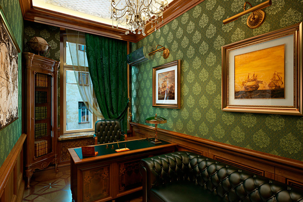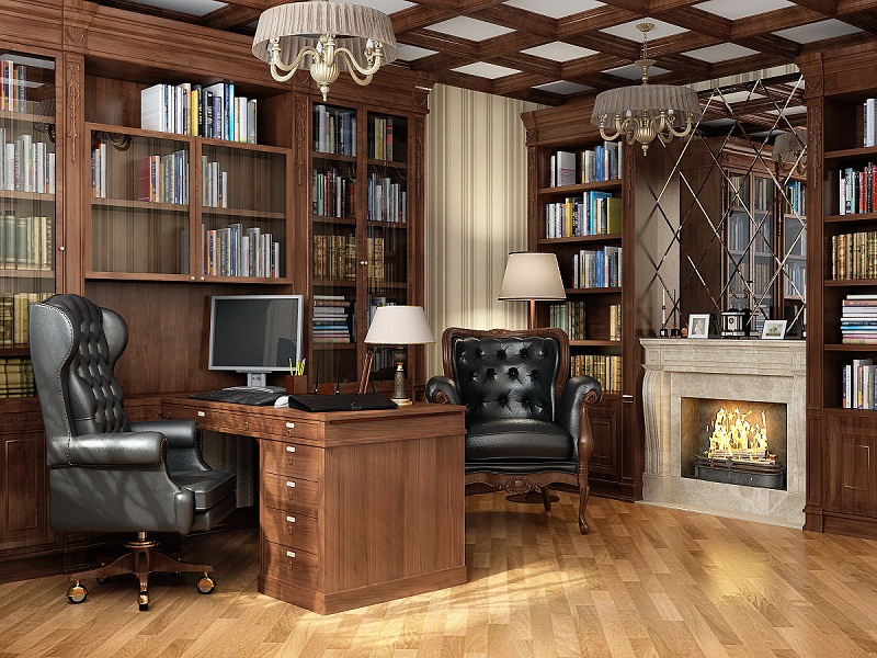 เก้าอี้สำนักงานราคาแพงที่ตกแต่งด้วยหนังและการตกแต่งด้วยไม้เป็นตัวเลือกที่เหมาะสำหรับตู้ในสไตล์คลาสสิก