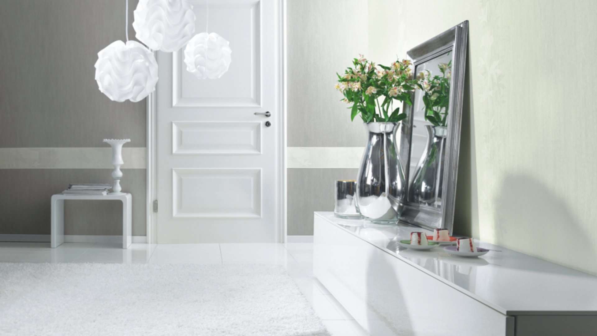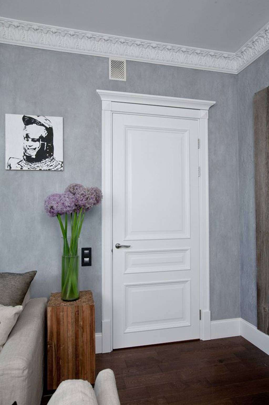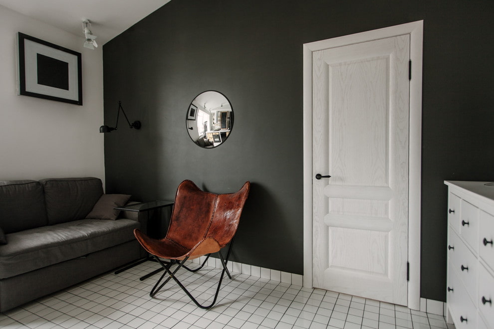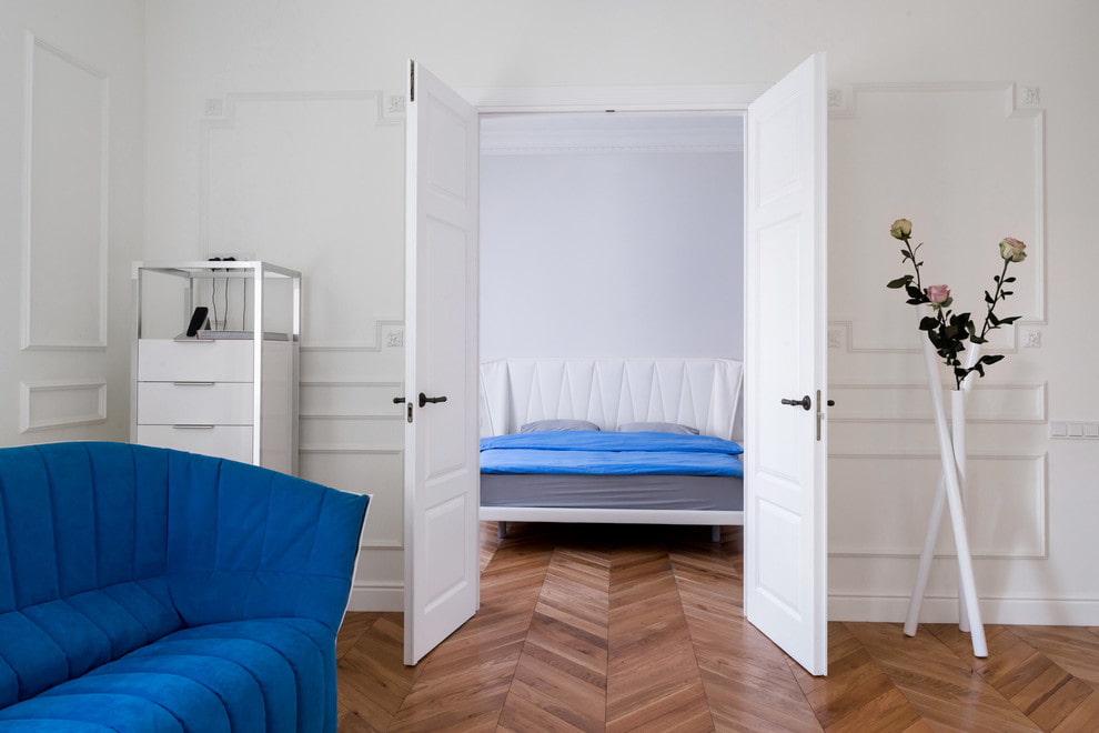 ประตูสีขาวในการตกแต่งภายในของอพาร์ทเมนท์จะกลายเป็นองค์ประกอบของความสนใจถ้าคุณเติมเต็มการตกแต่งด้วยองค์ประกอบการตกแต่งที่สดใส
