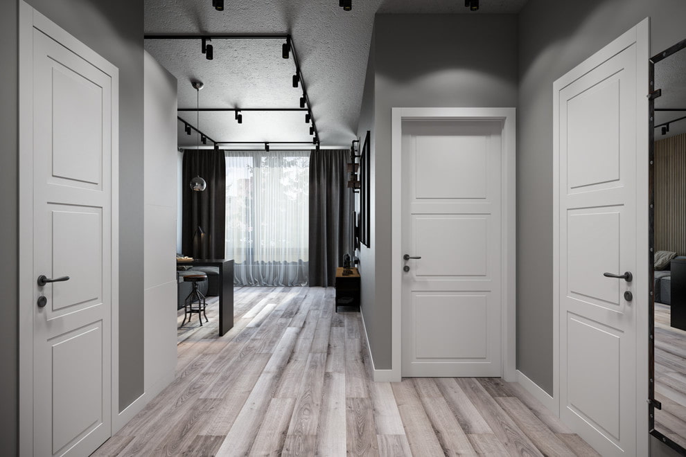 พื้นลามิเนตสีเทาที่จับคู่กับบอร์ดการรอบไฟสามารถไฮไลต์ประตูเพิ่มไปที่ด้านหน้า การจัดวางตำแหน่งของเฟอร์นิเจอร์อย่างมีเหตุผลในห้อง - การออกแบบอพาร์ทเมนต์ที่มีประตูสีขาวจะกลายเป็นโซลูชันที่ใช้งานได้