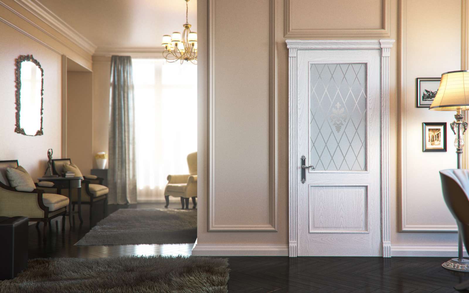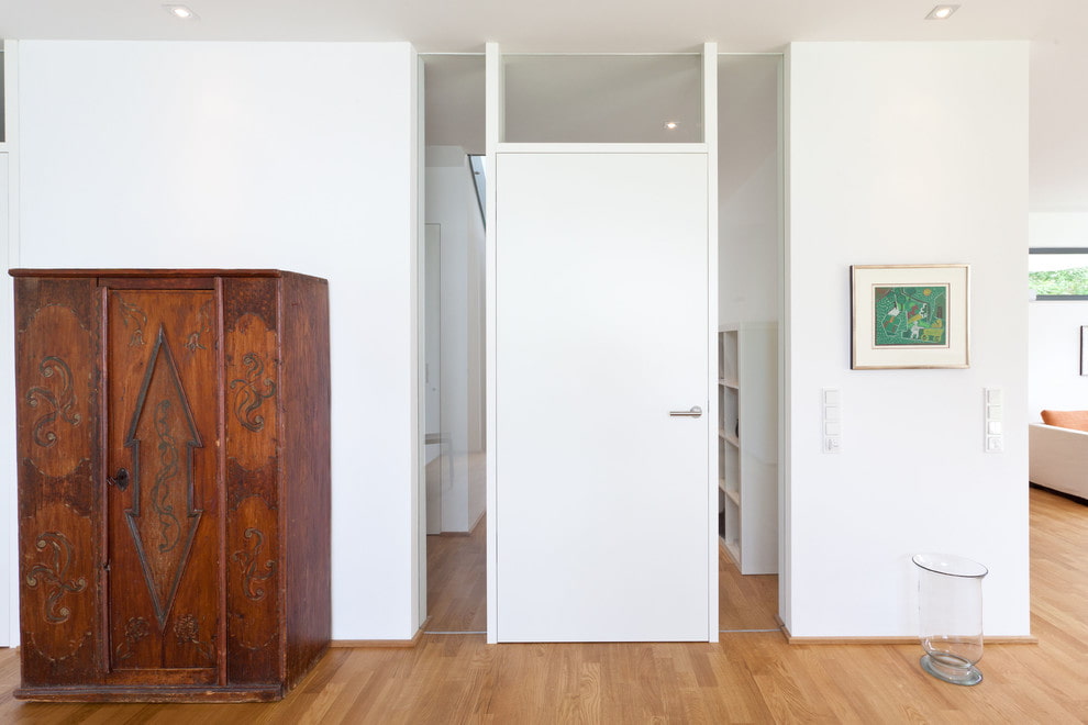 คุณสมบัติที่เป็นลักษณะเฉพาะของประตูสีขาวคือเส้นขอบที่มองไม่เห็นตัดกับพื้นหลังทั่วไป