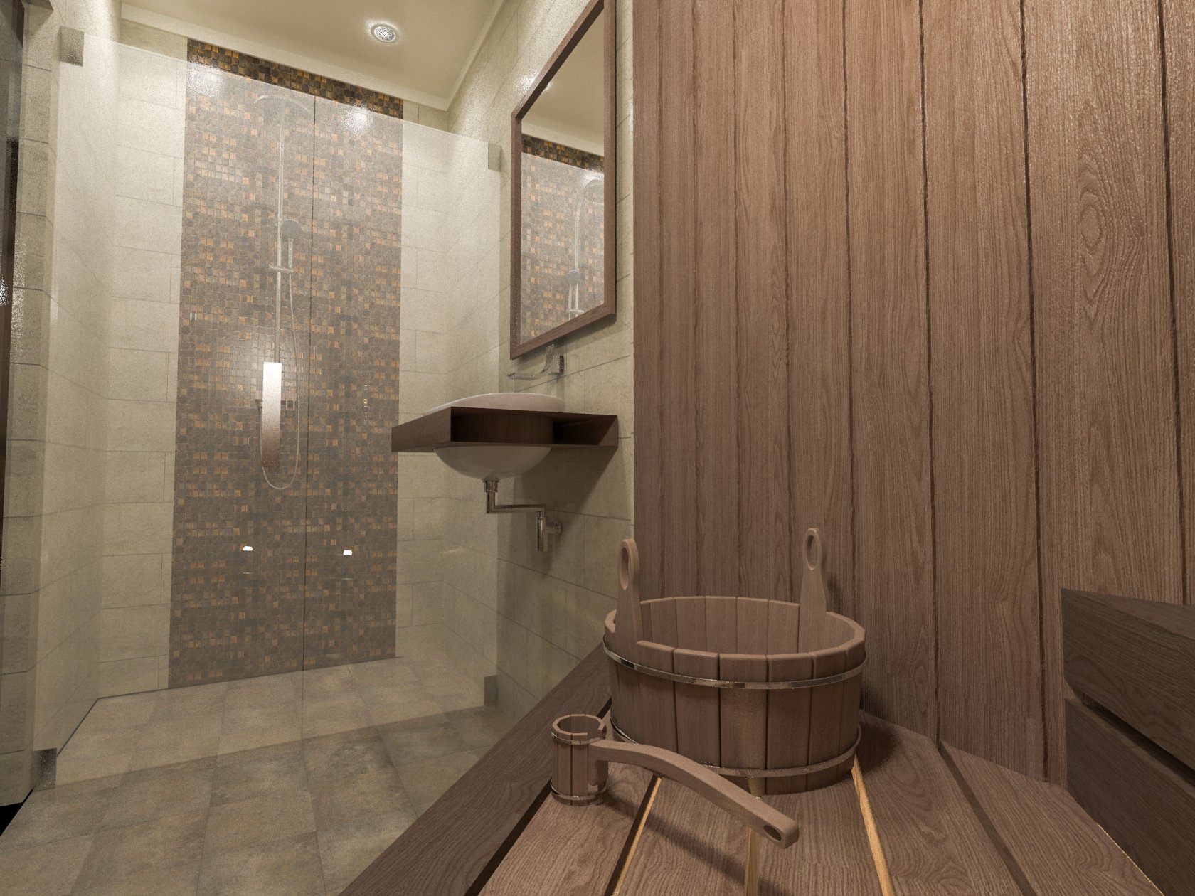 แบบจำลองมุมของห้องซาวน่าในห้องน้ำกว้างขวางของอพาร์ทเมนต์ในเมือง