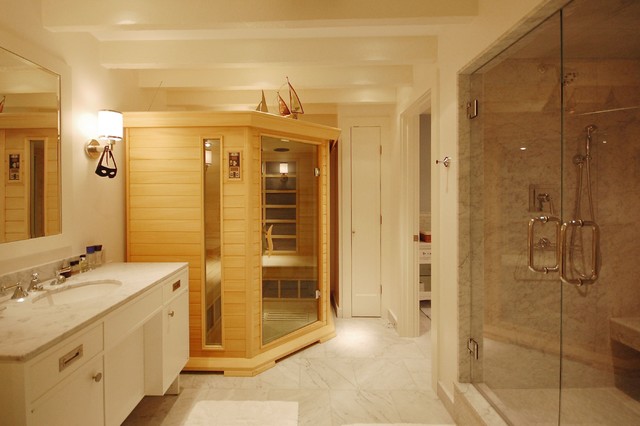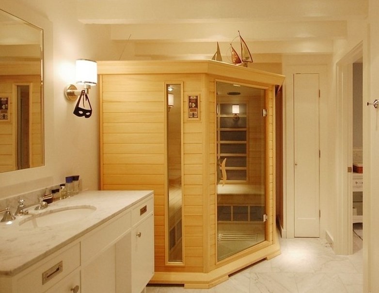 ตัวเลือกที่ง่ายที่สุดสำหรับห้องซาวน่าที่บ้านคือห้องอาบน้ำฝักบัวที่ติดตั้งเครื่องกำเนิดไอน้ำ