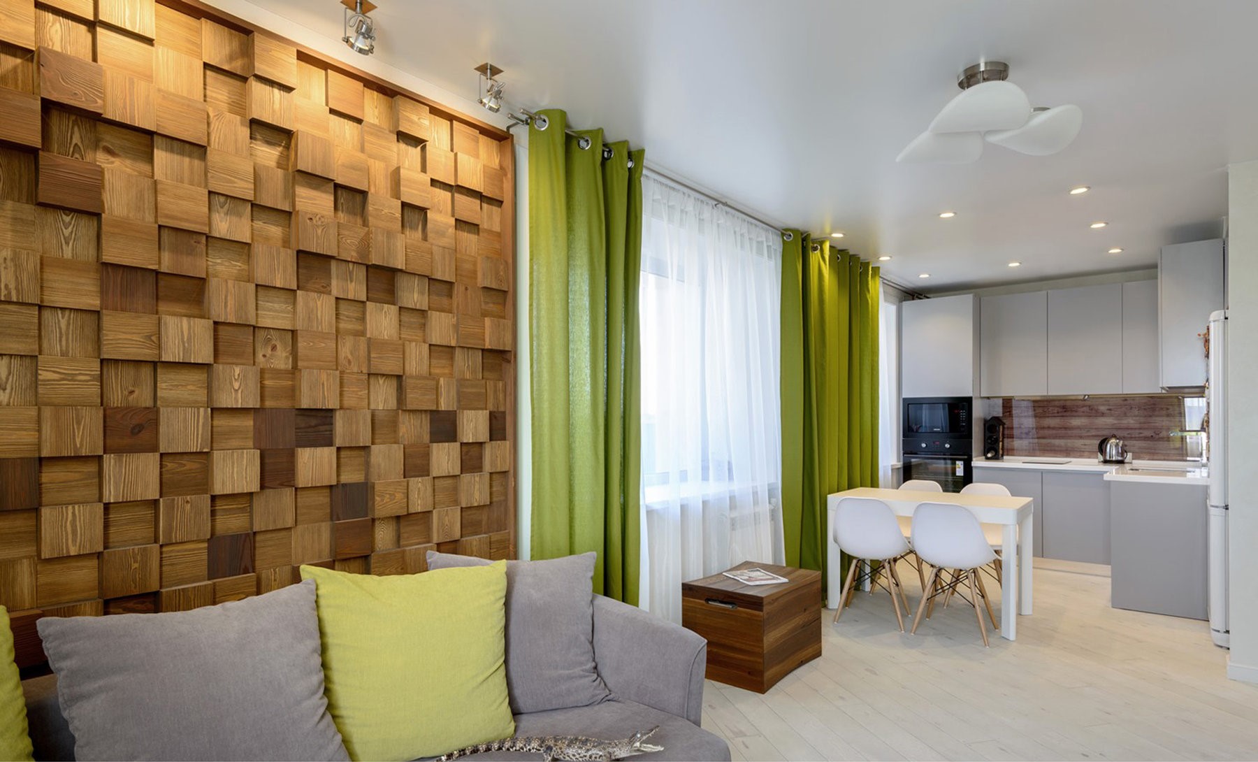 อพาร์ตเมนต์ทันสมัยขนาดเล็กและสะดวกสบายสามารถตกแต่งในสไตล์เป็นมิตรกับสิ่งแวดล้อม พื้นผิวที่ทำจากไม้สีเขียวของที่อยู่อาศัยเฟอร์นิเจอร์หวายบนระเบียงสิ่งทอที่ทำจากวัสดุธรรมชาติ - รูปแบบเชิงนิเวศน์ทำให้การตกแต่งภายในอบอุ่นและอบอุ่น