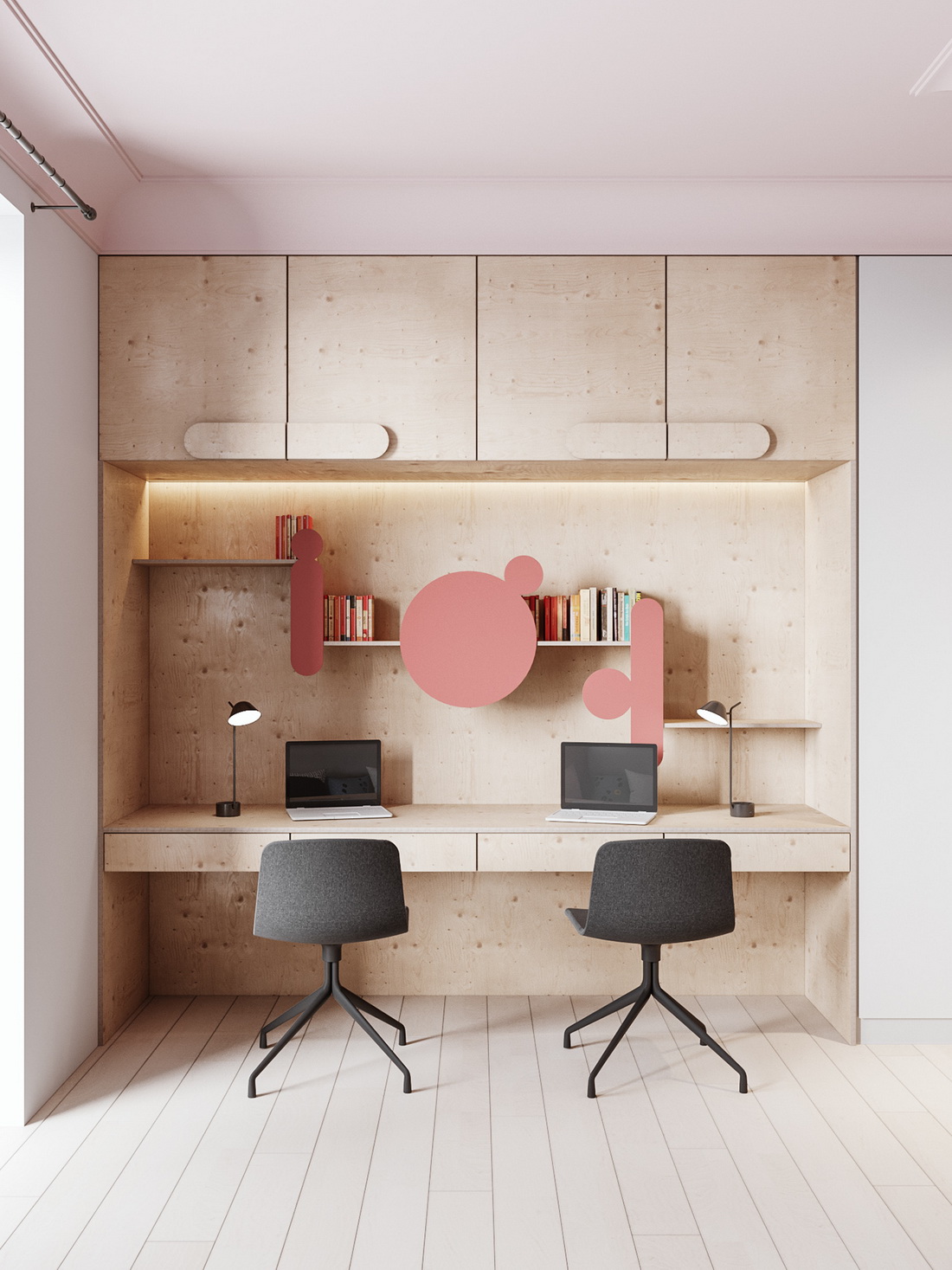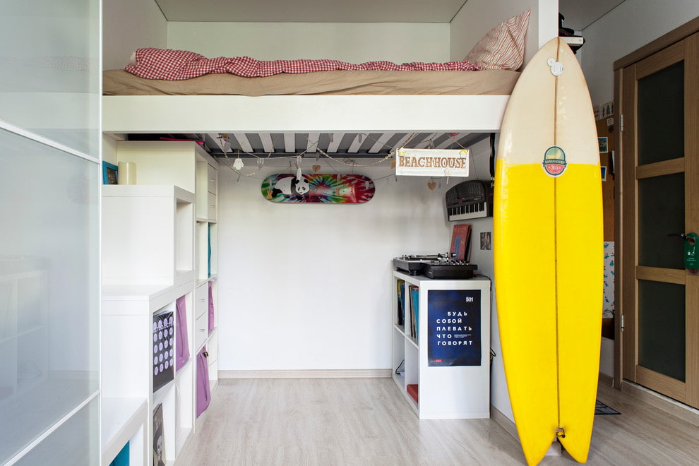 แนวคิดที่น่าสนใจสำหรับสตูดิโออพาร์ทเมนต์คือห้องนอนในลูกบาศก์ไม้ซึ่งมีพื้นที่ทำงานของห้องครัวอยู่ด้วย