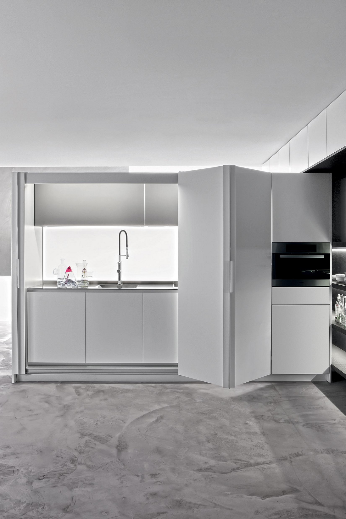 ในอพาร์ทเมนต์ขนาดเล็กทุกอย่างควรทำงานเพื่อขยายพื้นที่ - กระจกบานใหญ่พื้นผิวมันหน้าอาคารเงารายละเอียดของโครเมี่ยม