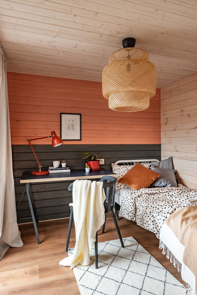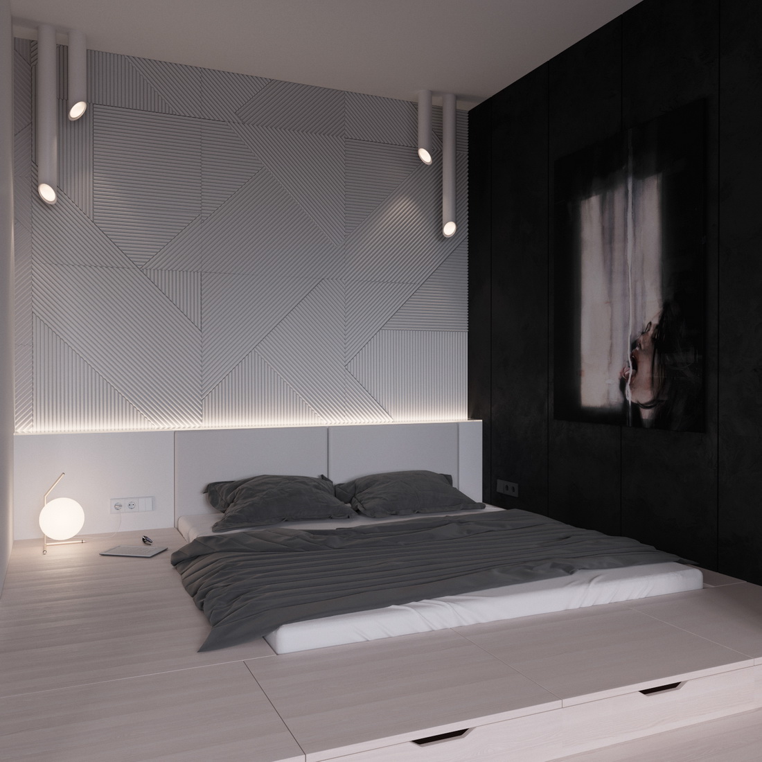 ผนังและเพดานสีขาวขยายพื้นที่และทำให้ห้องดูสว่างขึ้น