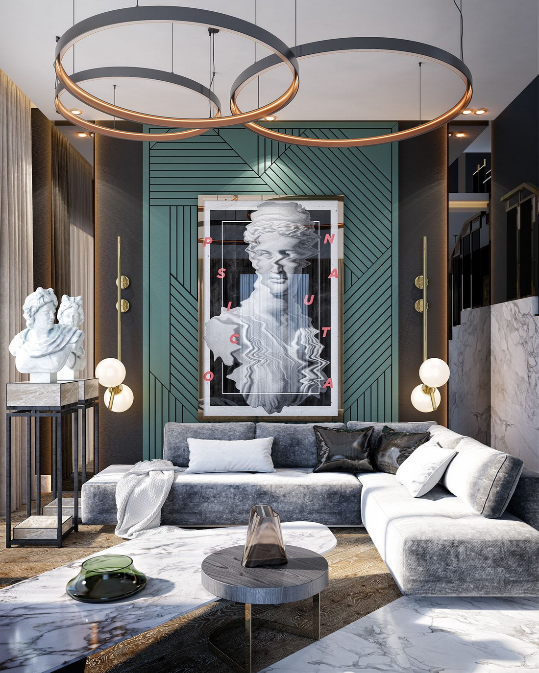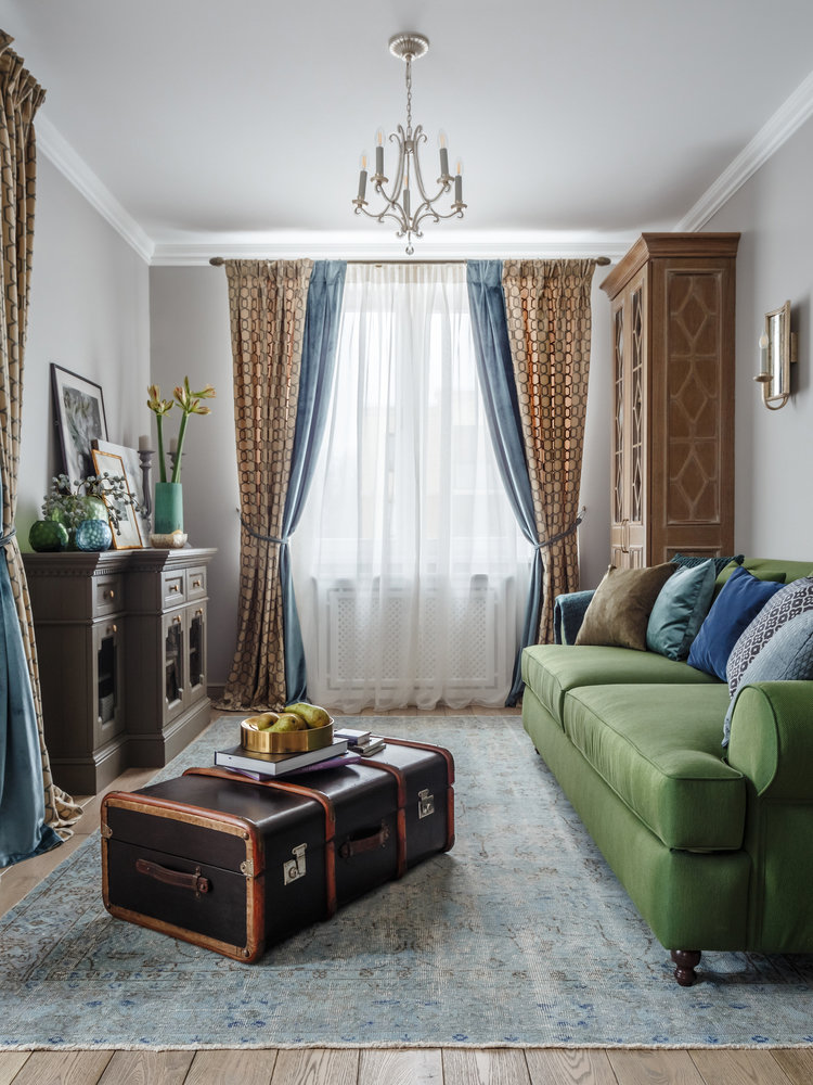 ในห้องนั่งเล่นคุณจำเป็นต้องหยิบเฟอร์นิเจอร์ตกแต่งเล็ก ๆ ตู้หนังสือและโต๊ะกาแฟ เฟอร์นิเจอร์แนะนำให้เลือกรูปทรงเรขาคณิตเพื่อให้ดูเหมือนไม่ใหญ่และหนัก