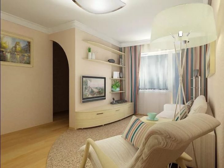 การตกแต่งภายในที่สดใสของครุสชอฟหลังจากเข้าครัวไปที่ห้องนั่งเล่น